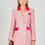 This tweed blazer combines a classic style with modern elements and has details like velvet trim and pearl buttons. The high-quality tweed fabric is made with various shades and a touch of sequins.