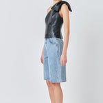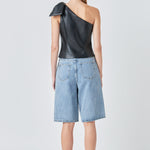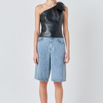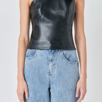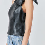 Introducing our chic Asymmetric Faux Leather Top with Bow Tie perfect for adding a touch of luxury to your wardrobe. This one shoulder top features a non-functional bow tie for a feminine touch and a side invisible zipper for a seamless silhouette. The fitted design enhances your figure making it a versatile option for any occasion. Made with high-quality faux leather this top is both comfortable and stylish. Elevate your look with this statement piece and stand out from the crowd. Perfect for both casual outings and special events. Shop now and complete your collection with this must-have top.