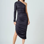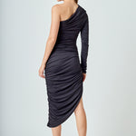 Look forever-stylish in this Asymmetrical Knit Midi Dress. One shoulder silhouette is designed with a fitted bodice shirred at side seam and a one-side slit opened to create a sleek shape. Channel effortless chic with this must-have dress as it will become one of your favorite go-to pieces.