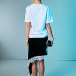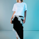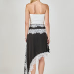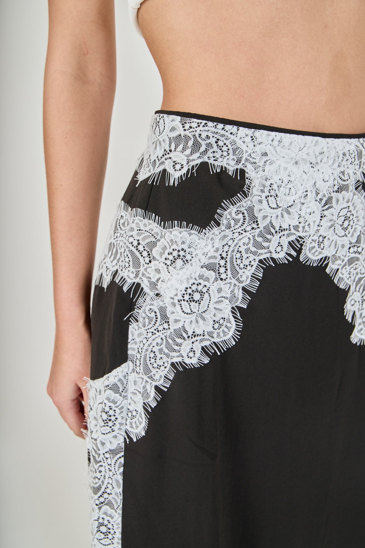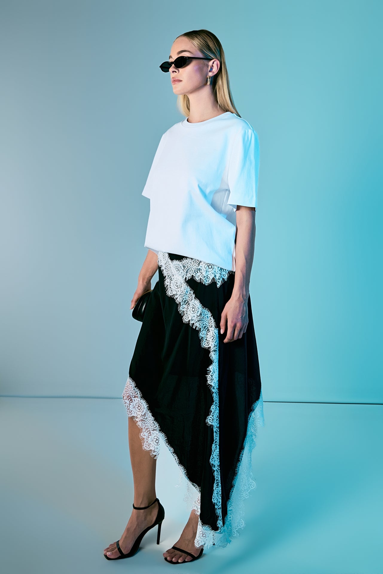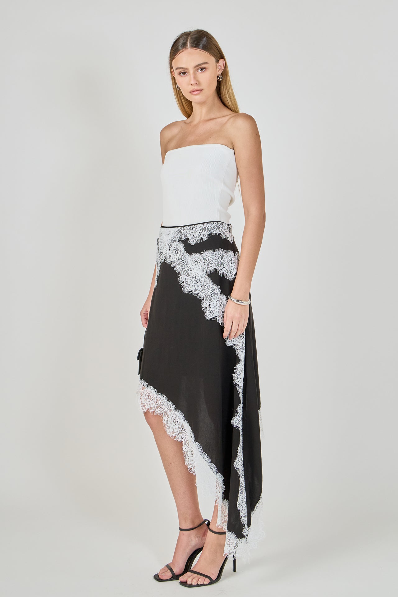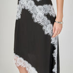 Indulge in effortless elegance with our Asymmetrical Lace Trim Midi Skirt. Crafted from luxurious silk fabric, this high-waisted skirt offers a smooth and comfortable fit. The delicate lace detailing adds a touch of femininity, while the asymmetric hemline adds a modern and chic twist. Perfect for day or night, this skirt is a must-have in your wardrobe. Pair it with a tucked-in blouse and heels for a sophisticated look. Elevate your style game with our Asymmetrical Lace Trim Midi Skirt.