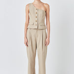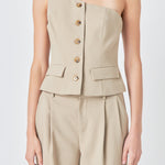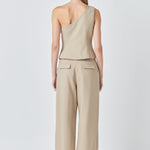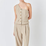 Introducing our stylish Asymmetrical One Shoulder Vest - the perfect addition to your wardrobe! Featuring a trendy one shoulder design and front buttons this top exudes a chic and modern vibe. The asymmetrical hemline adds a touch of edginess to the classic silhouette. But that's not all - with non-functional front pockets you'll have the perfect balance of fashion and functionality. This versatile piece is perfect for any occasion and is sure to elevate any outfit. Shop now and be the center of attention!