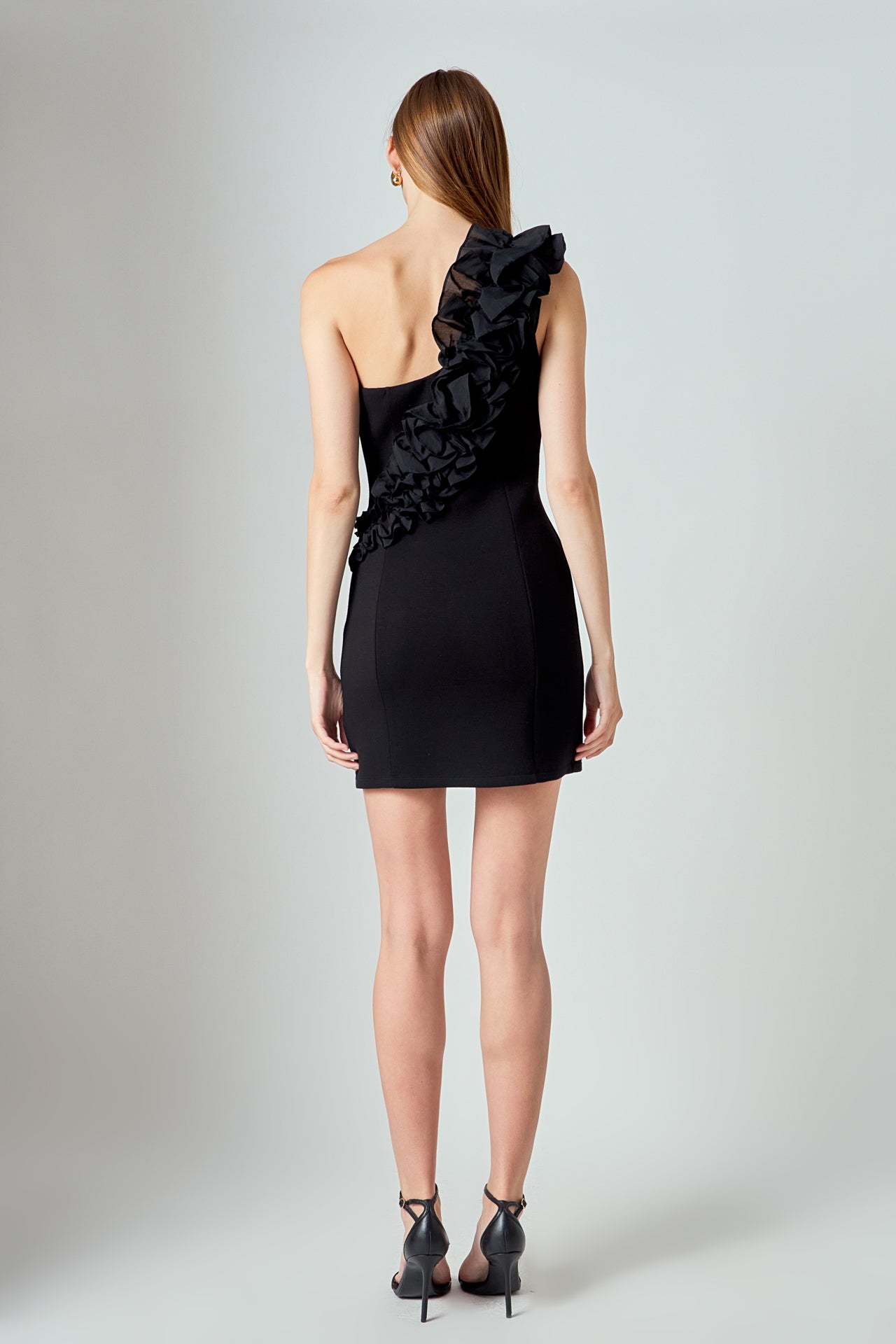 Make them turn heads in our stylish Asymmetrical Ruffle Stretch Mini Dress. This one-shoulder dress features contrast ruffles a fitted bodice and a side invisible zipper. Show off your sense of fashion with this contemporary dress that won't go unnoticed. Our dress is perfect for parties or a night out with friends. Stand out from the crowd with this unique take on dress design and let your wardrobe do the talking.