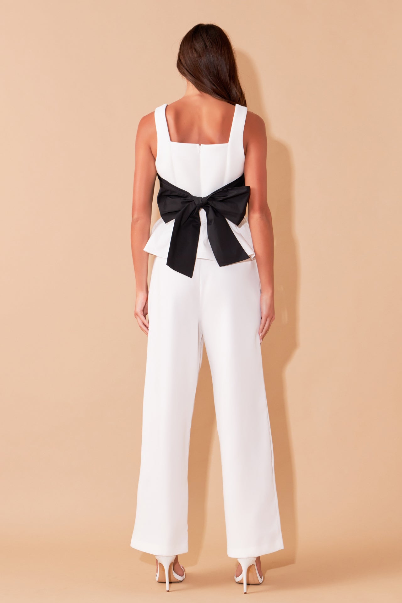 Stay cool and stylish with this Back Bow Contrast Top! Crafted from a knit bodice and a poplin peplum it offers the perfect combination of comfort and elegance. The regular fit and sleeveless design makes it perfect for the warm summer season.