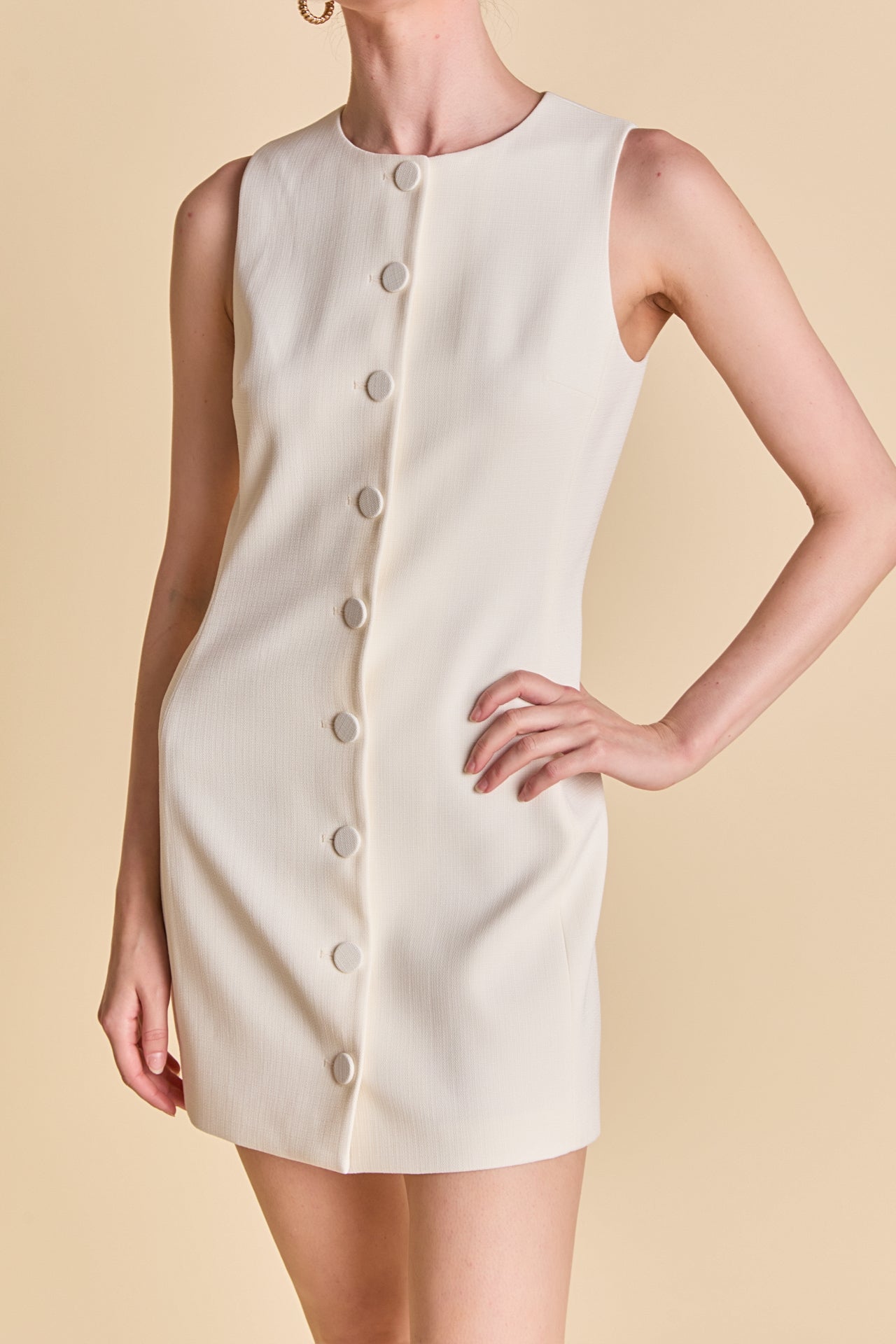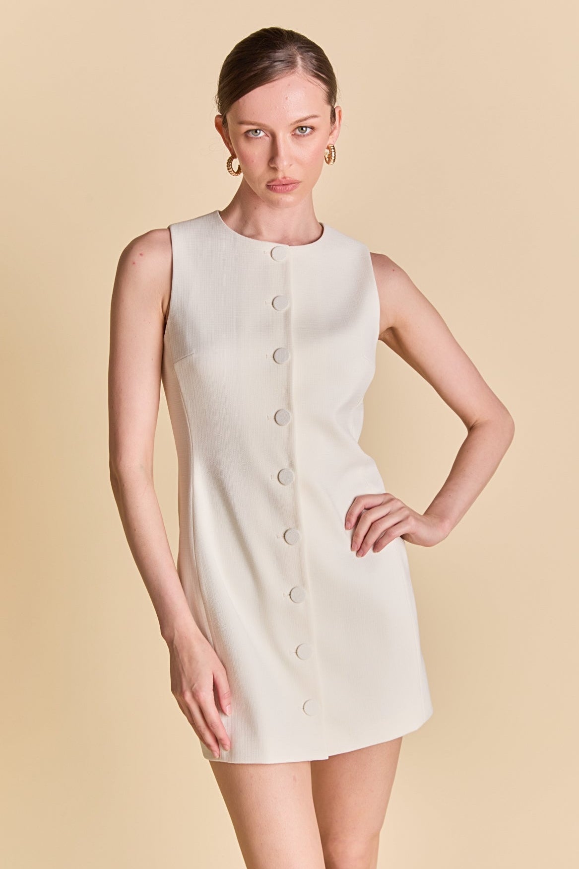 Our Blend Round Neck Buttoned Mini Dress is a must-have for the fashion-forward woman. This mini dress features a flattering round neckline and eye-catching front buttons for a touch of elegance. The sleeveless design allows for easy layering and showcases your arms beautifully. With its mini length, this dress is perfect for any occasion, from a casual day out to a chic night out. Made with high-quality fabric, this dress offers both comfort and style. Add this versatile piece to your wardrobe to make a statement. Perfect for spring and summer, this dress will have you turning heads everywhere you go.