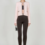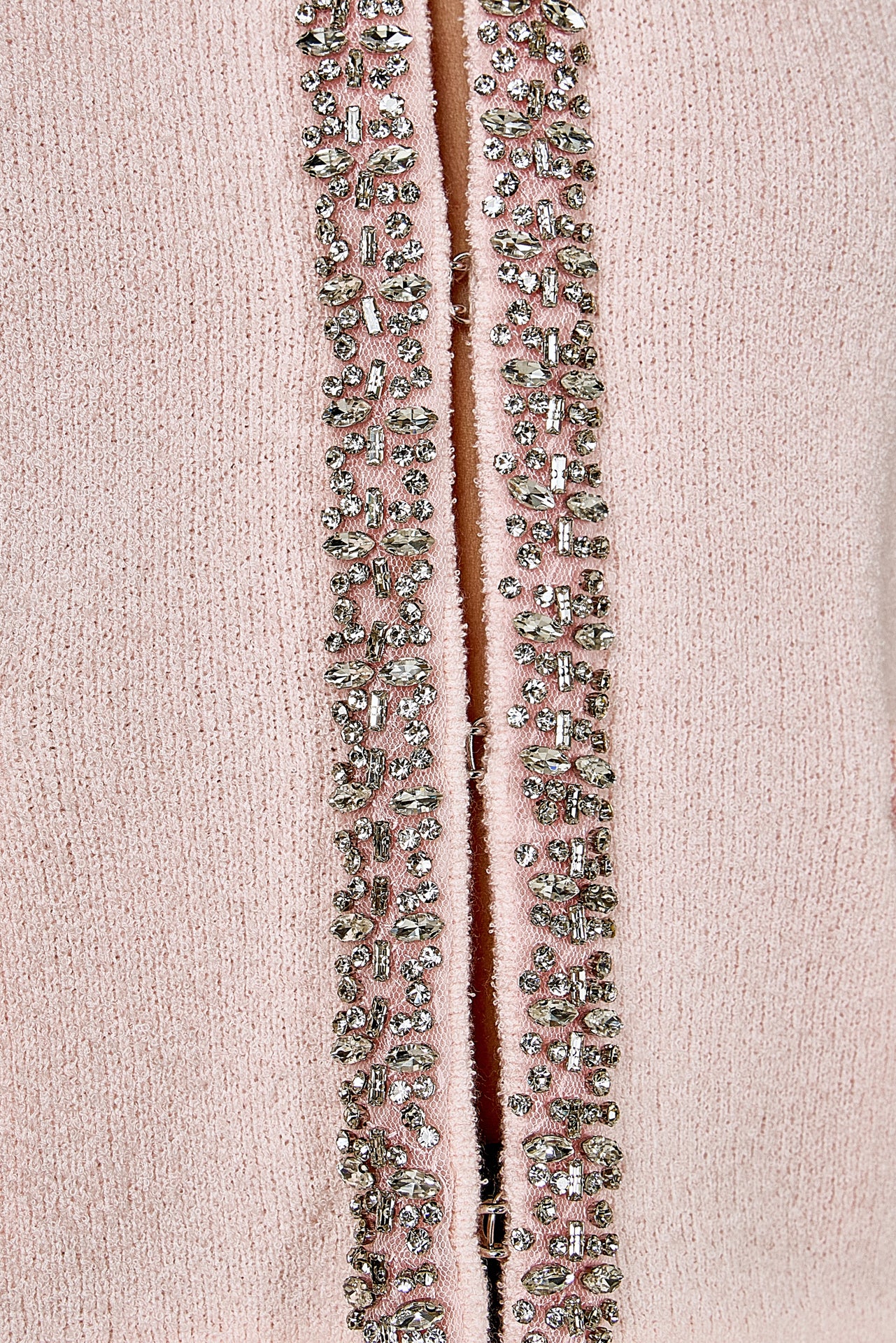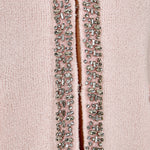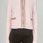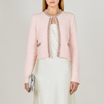Elevate your wardrobe with our Boucle Knit Jewel Trim Sweater Cardigan. Crafted from textured boucle knit, it features a classic round neckline, structured welts, and elegant jewel trim for a sophisticated touch. Perfect for layering over casual or dressy outfits, this versatile cardigan combines style and comfort, making it a timeless addition to any wardrobe.