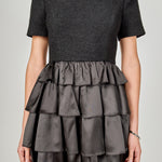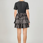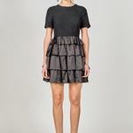 The must-have dress for fall this mini frock features contrasting satin tiers that add visual interest and dimension. The short sleeves and round neckline make it appropriate for work or play while the mini length shows just enough leg to flirt. Pair it with booties for an easy but put-together weekend outfit.