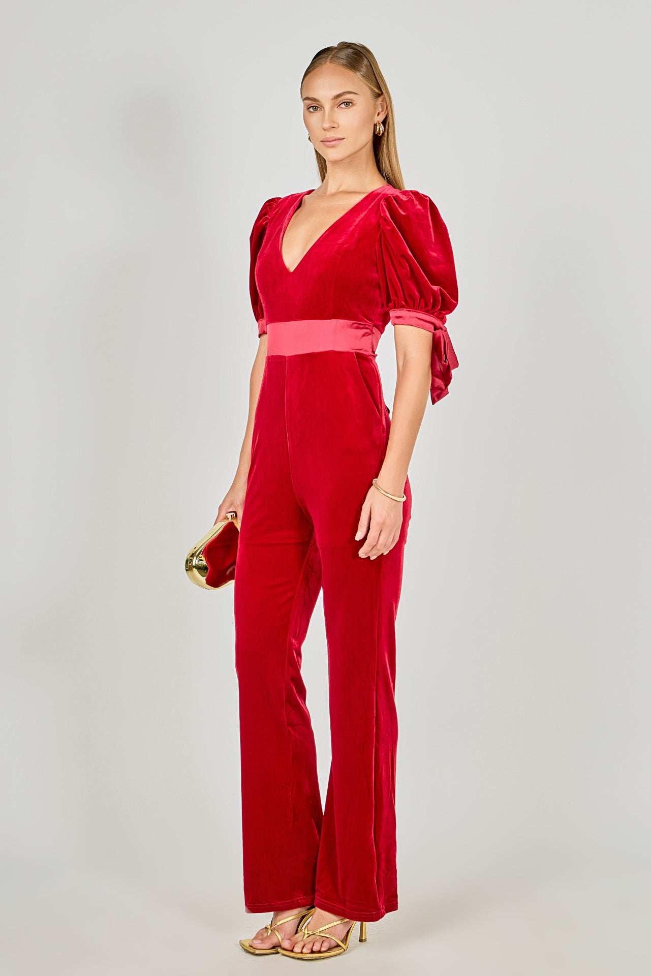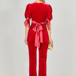This stylish Bow Tie Sleeve Velvet Jumpsuit exudes sophistication. It is crafted from luxuriously soft velvet with contrasting satin at the sleeves and waist tie. With a slim fit a deep V-neckline and a waist belt it is tailored to flatter the feminine figure. With its luxurious and unique design, this jumpsuit is designed to make you look chic and make a fashion statement.