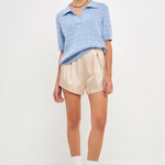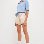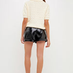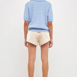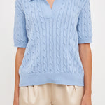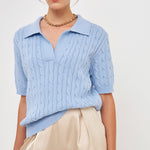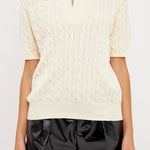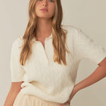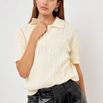 This cable knit sweater is not only soft and comfortable but also stylish. The collar and short sleeves add a modern twist and make this sweater easy to pair with all of your favorite bottoms. Whether it's faux leather pants or a high-waisted skirt this sweater will add the perfect cozy element.