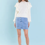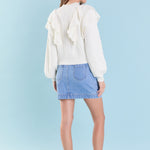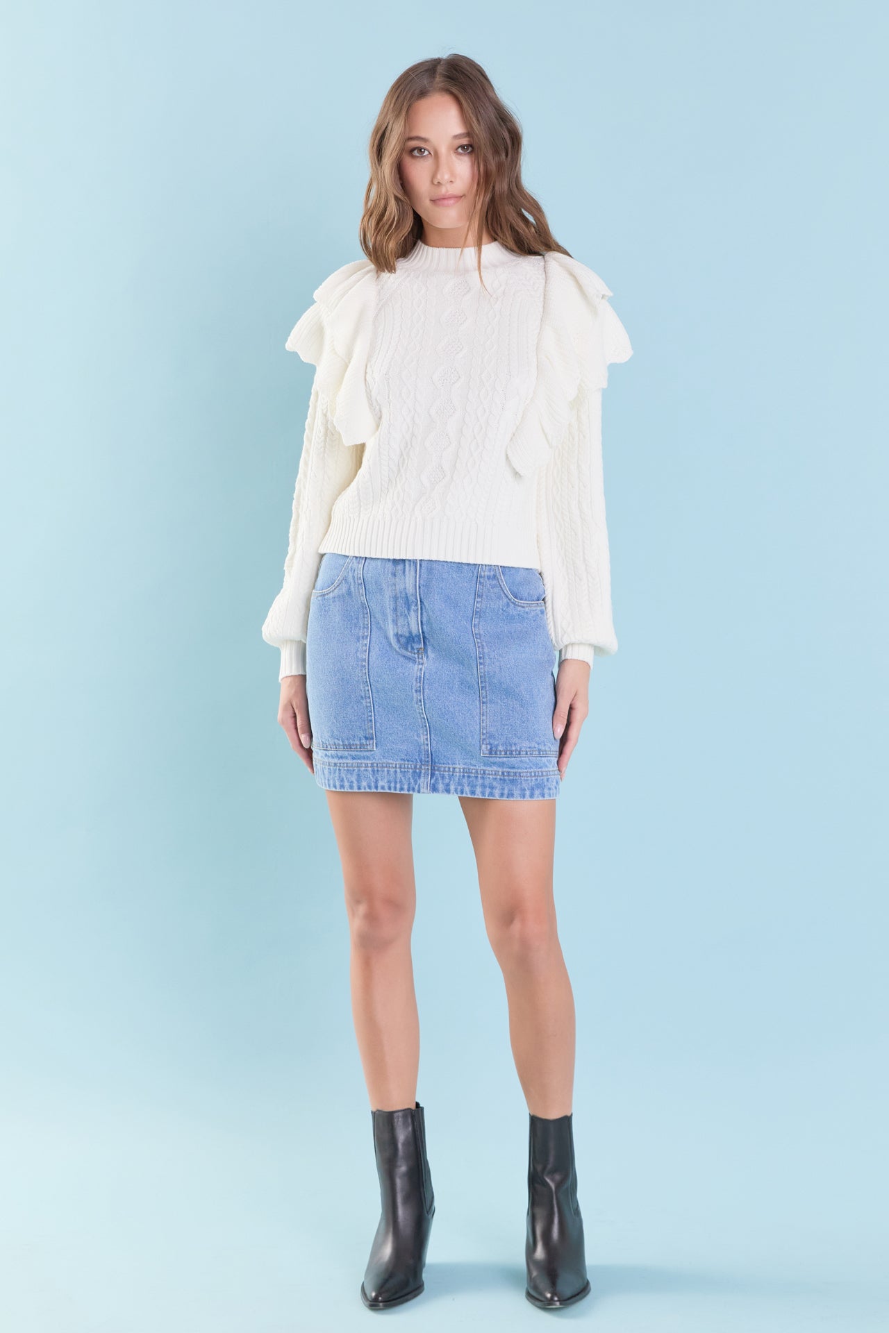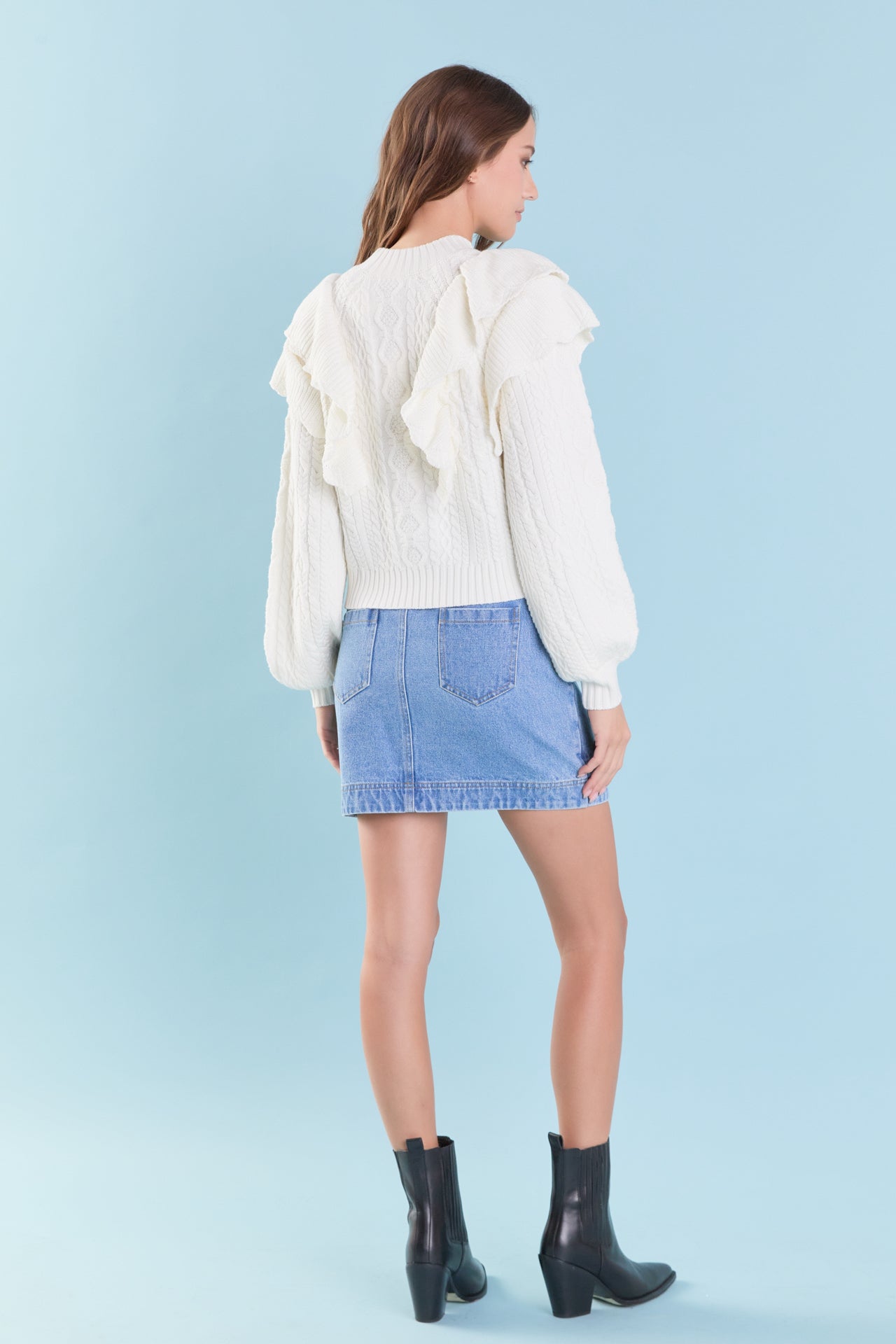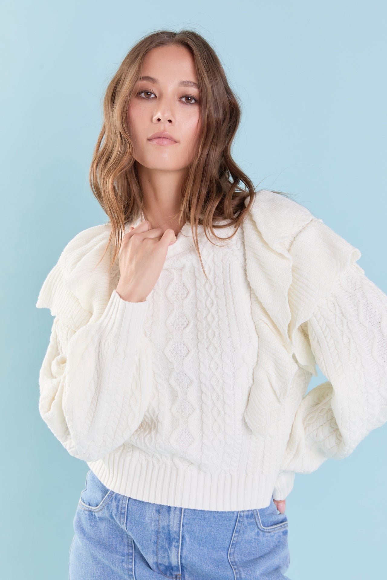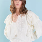 Elevate your sweater game with our Cable Knit Ruffled Sweater! The perfect combination of classic and trendy, this sweater features a cozy cable knit design and charming ruffle detailing. Its mock neck adds a touch of sophistication, making it perfect for any occasion. Made from high-quality materials, it offers both comfort and style. Whether you're dressing it up for a night out or keeping it casual for a day out, this sweater will keep you feeling and looking your best. Shop now and add this must-have piece to your wardrobe!