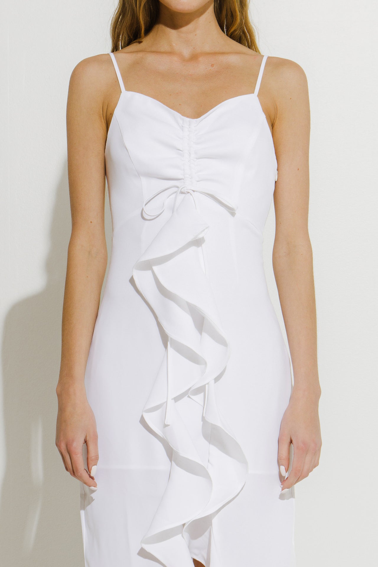 - Ruched detail at front bodice with ties