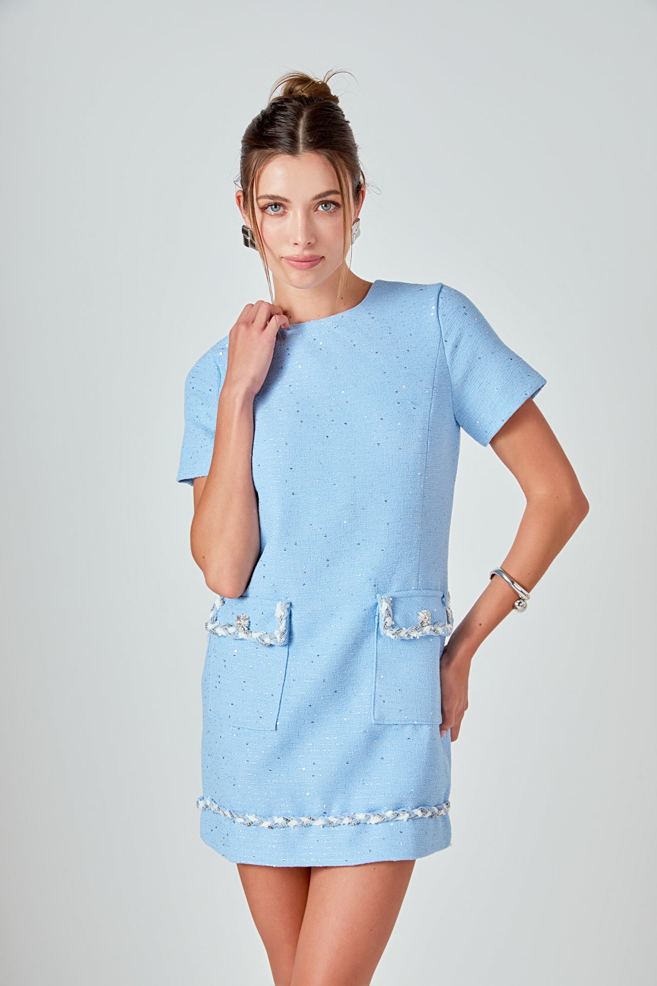 Our timeless classic Romy Chain Embellished Short Sleeve Tweed Mini Dress is one-of-a-kind. It features a chic mix braided trim that adds a bold, edgy twist and jewel buttons that give it a retro flair. Ideal for warmer days, this dress is mini in length and features short sleeves. Pair it with simple jewelry for formal events, or simple ballet flats for a shopping day. Explore our collection for more unique styles!