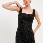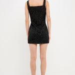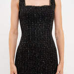 This sequin tweed mini dress is accented with a chain trim, which is made from a high-quality faux leather strip and gold chain.