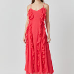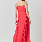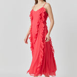 This Chiffon Ruffle Spaghetti Maxi Dress is a gorgeous and unique piece for your wardrobe. Its maxi length is elegant, while the ruffle detail adds a touch of sophistication. With a side slit and invisible side zipper closure, it ensures a flattering fit and emphasizes your beautiful curves. Perfect for whatever occasion, this stunning and comfortable dress is sure to look amazing on you.