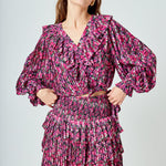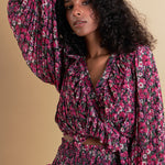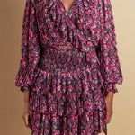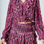 Bring a little romance to your wardrobe with this ultra-feminine chiffon floral printed ruffled crop top. Delicate ruffles cascade down the pleated self and meet at the crop length. A wrap style and V neckline complete the look, while a self waist band helps keep everything in place.