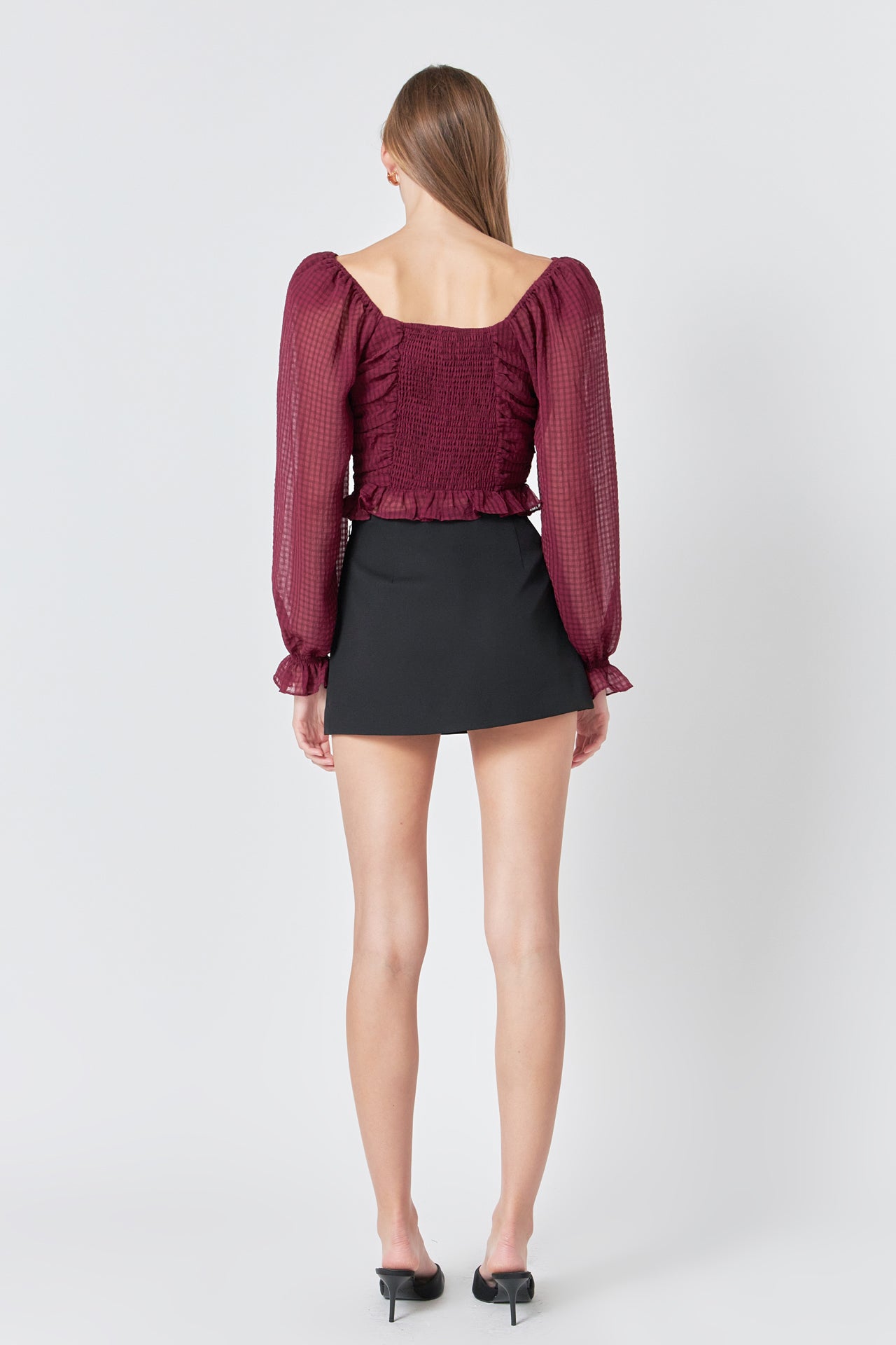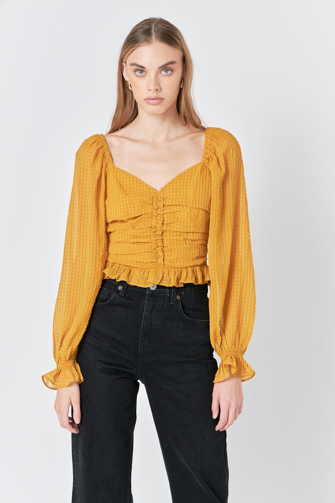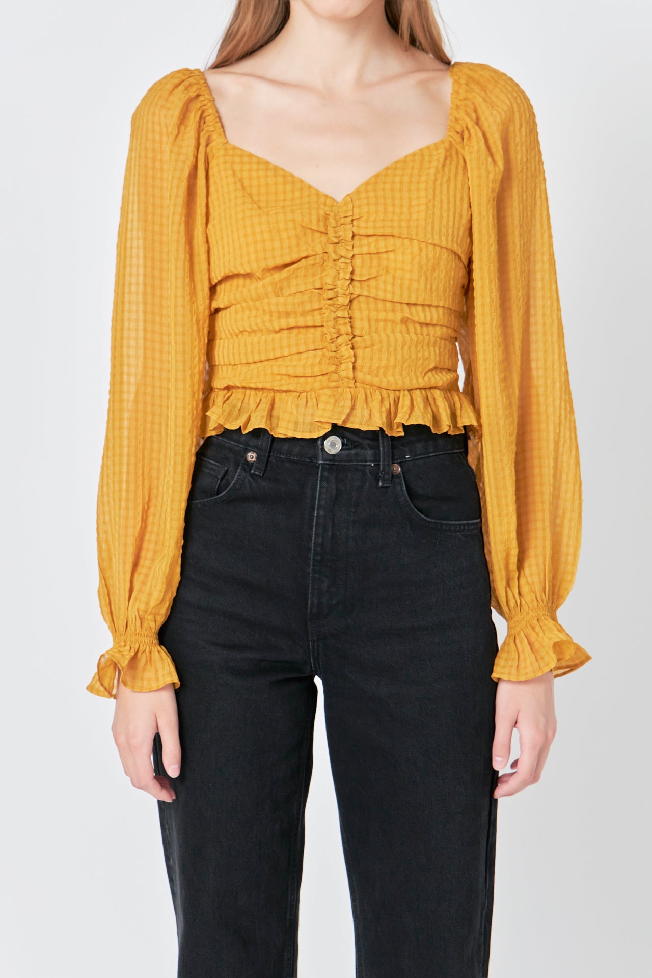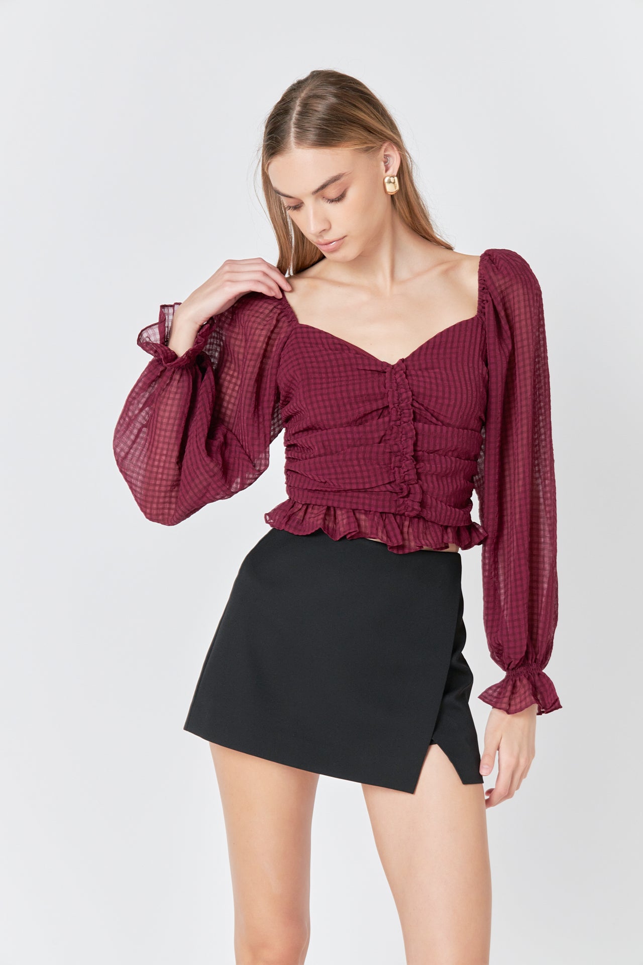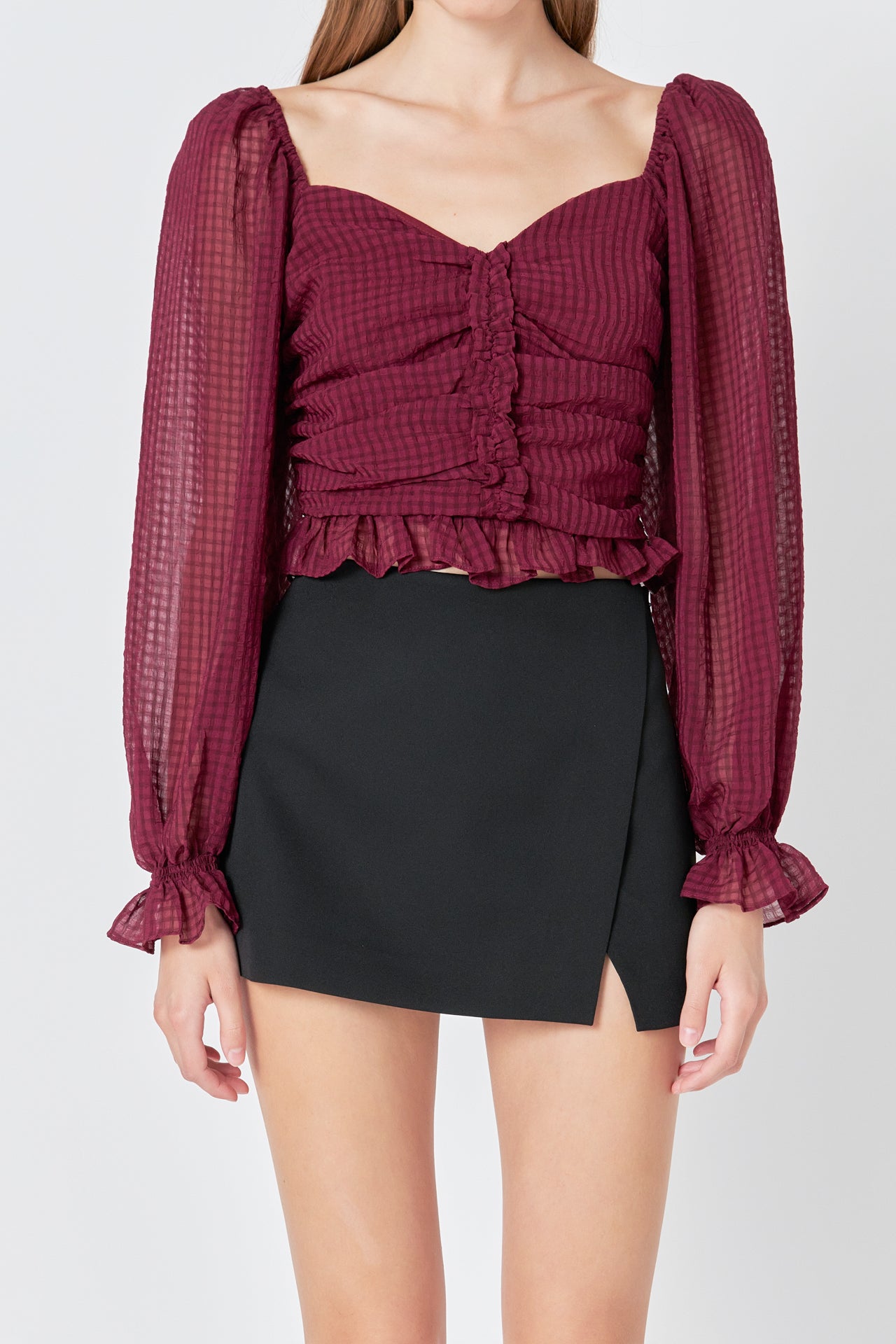 Make a statement with this Chiffon Gridded Ruched Top! This sweetheart neckline shirt comes with ruched bodice center front ruffle detail and a unique long puff sleeve. It is perfect for any occasion offering a chic and fashionable look. Crafted with the finest materials this is a must-have item in your wardrobe! Stand out from the crowd and shop now for the most unique blouse.