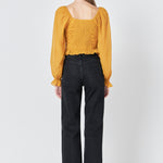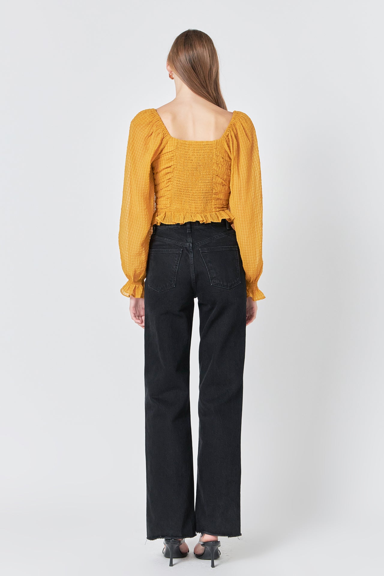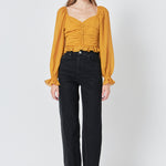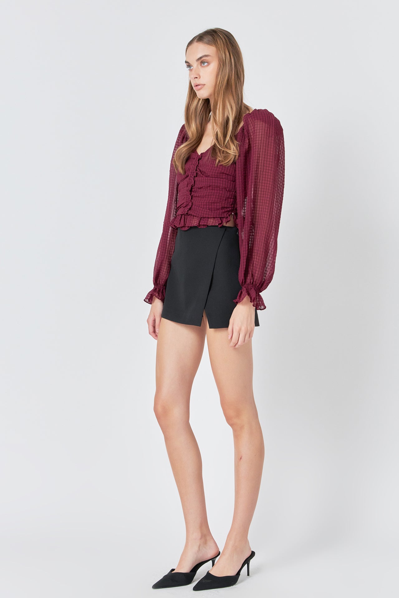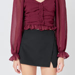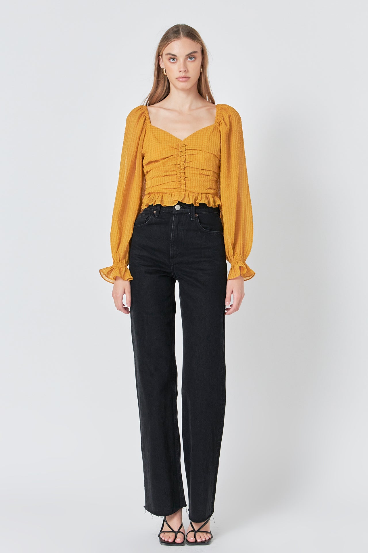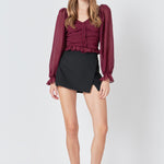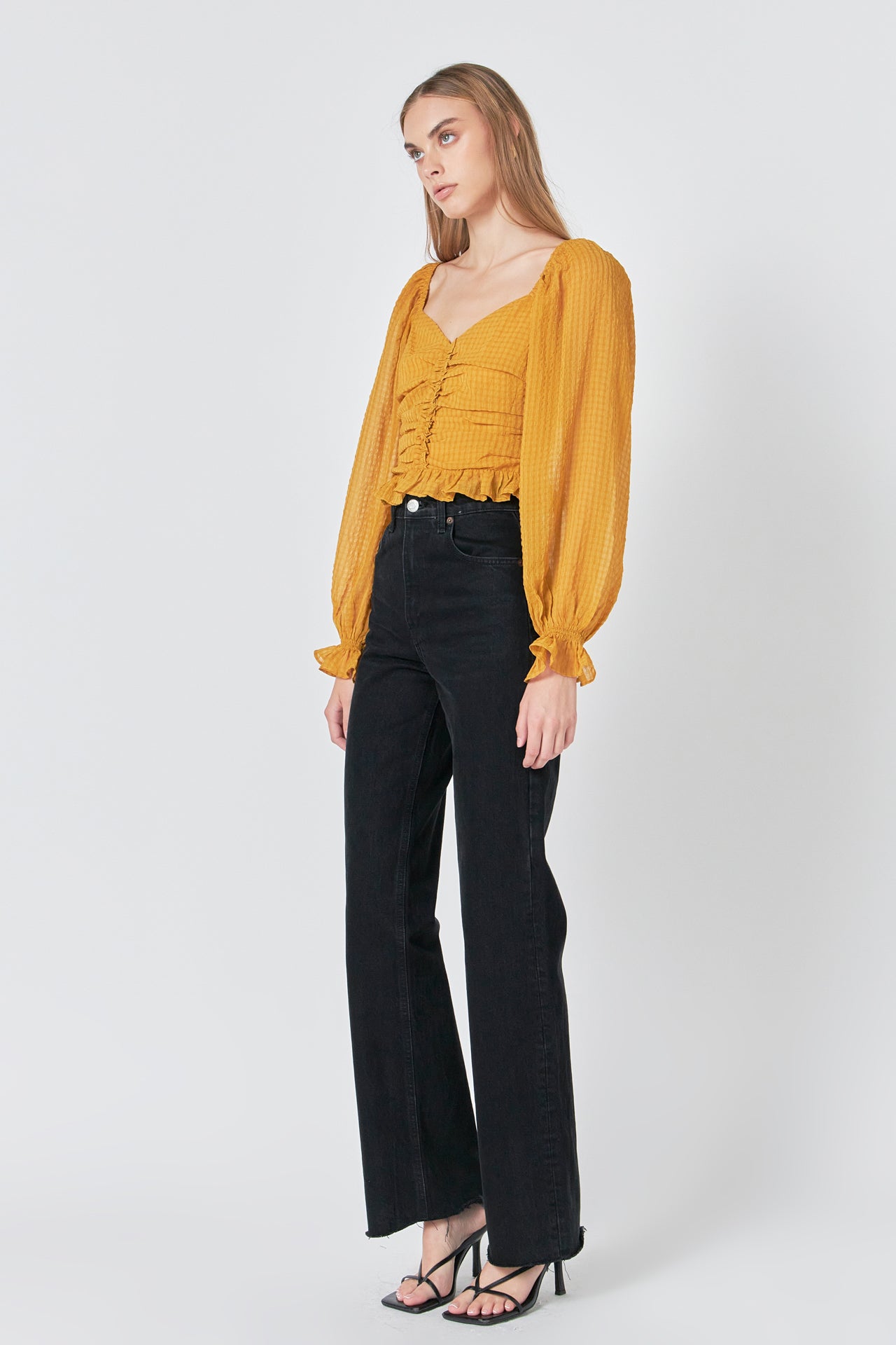 Make a statement with this Chiffon Gridded Ruched Top! This sweetheart neckline shirt comes with ruched bodice center front ruffle detail and a unique long puff sleeve. It is perfect for any occasion offering a chic and fashionable look. Crafted with the finest materials this is a must-have item in your wardrobe! Stand out from the crowd and shop now for the most unique blouse.