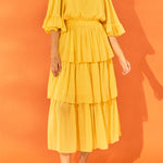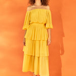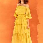 For a touch of elegance, this maxi will be your go-to. With an off the shoulder neckline and ruffled tier design, this maxi is perfect for any special occasion. Made with sheer chiffon fabric and lined with soft fabric, it's also comfortable to wear. With an elastic waistband, it's easy to put on and take off.
