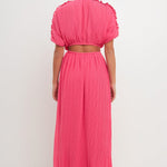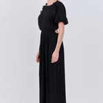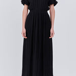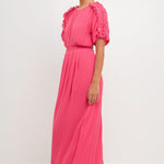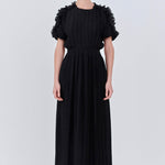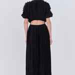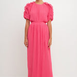 Step out in timeless glamor with this chiffon plisse back cutout maxi dress. Crafted from a lightweight chiffon fabric this loose-fitting maxi dress features short sleeves with ruffle detail and a back waist cutout detail for the perfect blend of style and comfort. Elevate your evening looks with the perfect finishing touch. This breezy maxi dress.