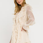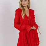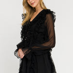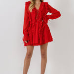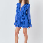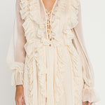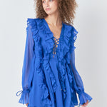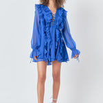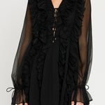 This leg-baring mini dress features cascading ruffles on the front and back that accentuate the flowy silhouette. The blouson sheer sleeves flow into wrist ties and a ruffle hem and the style is finished with a lace-up bust.