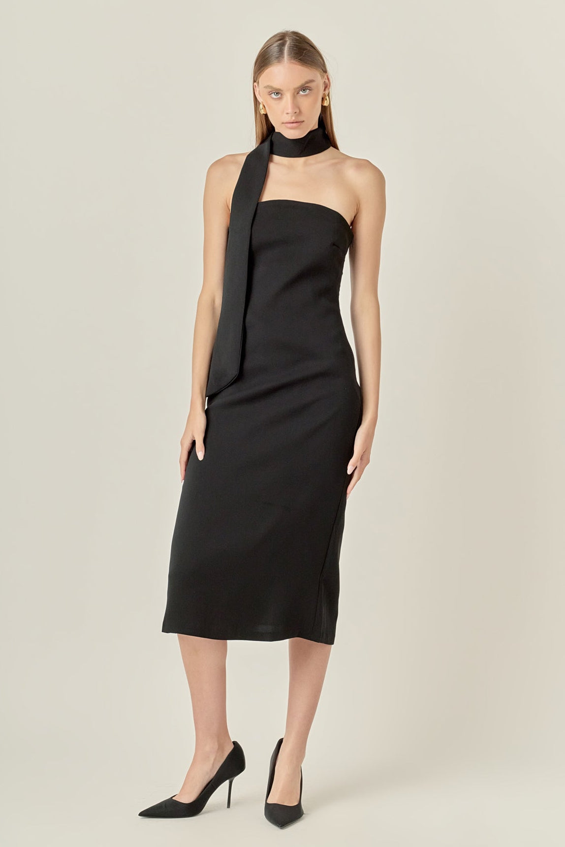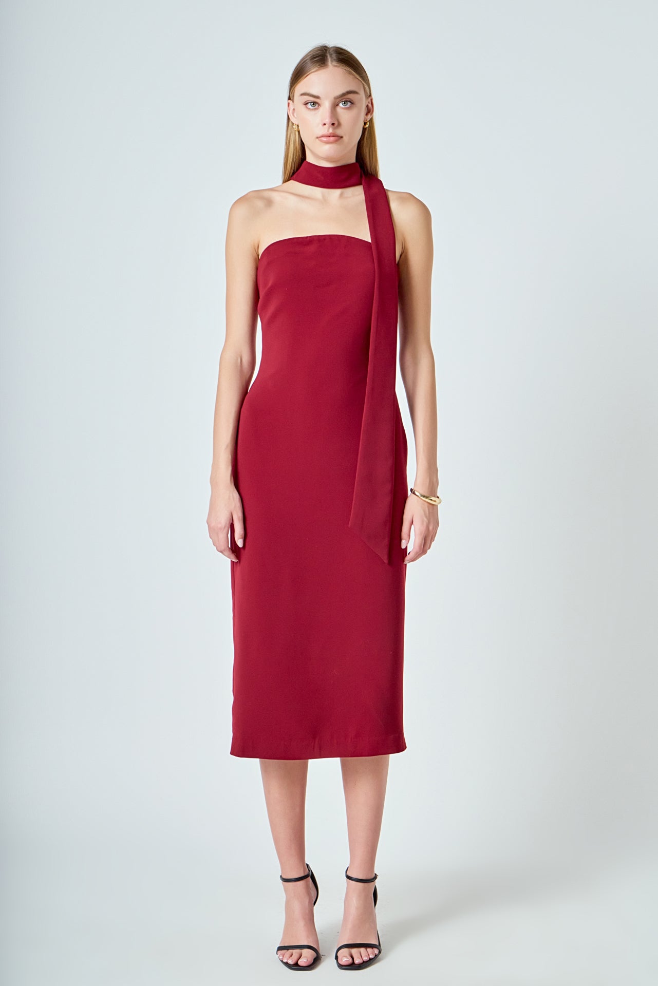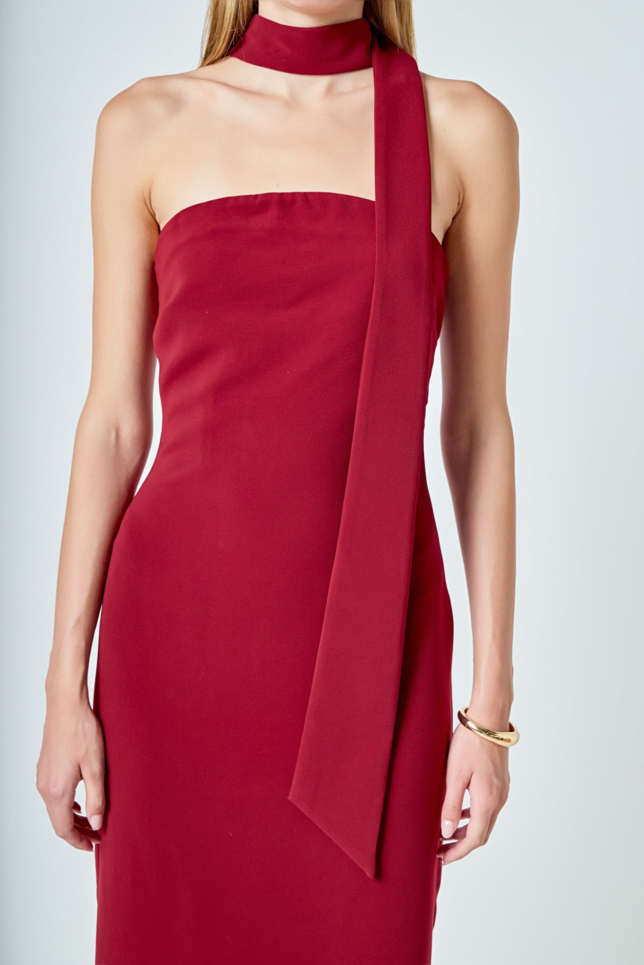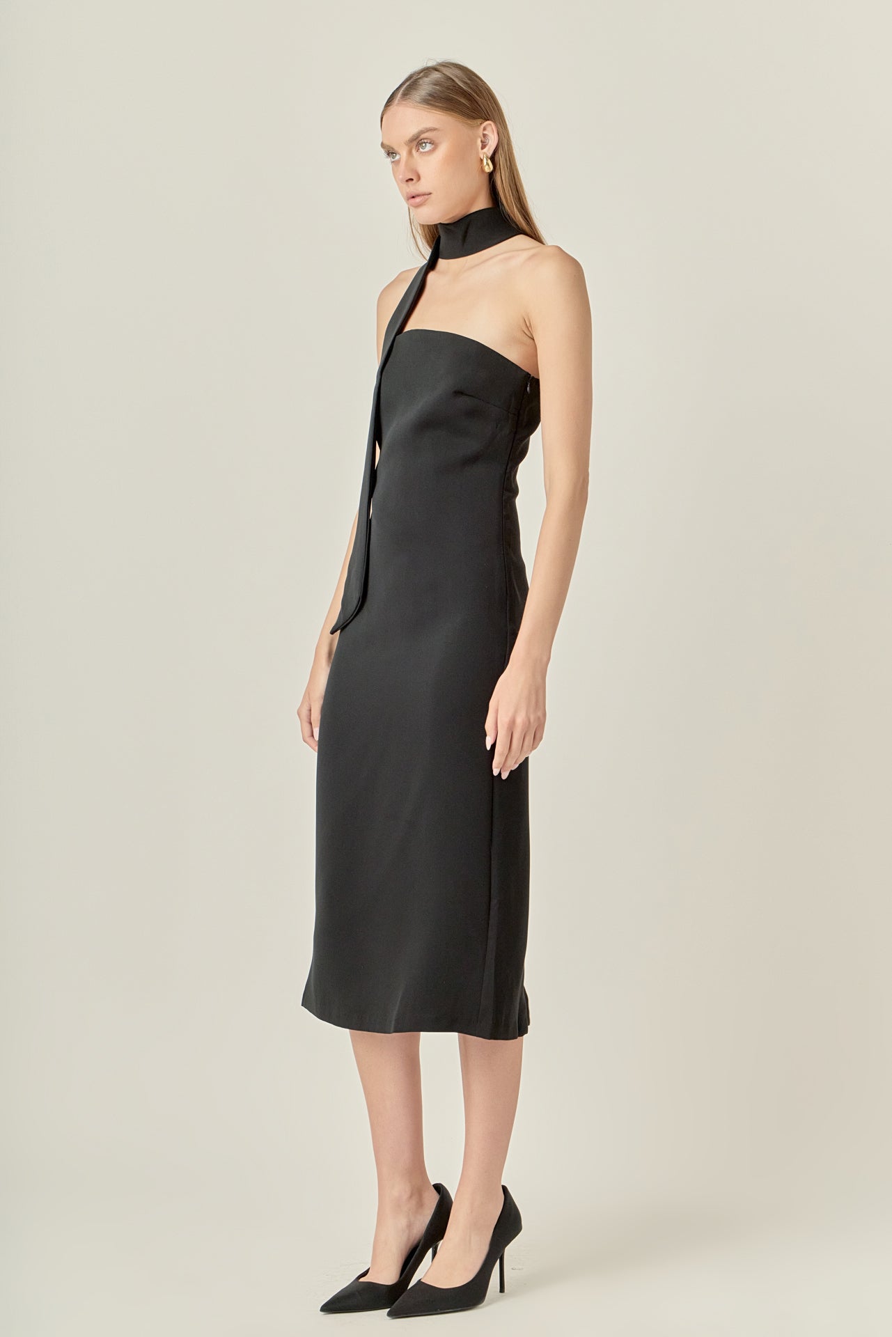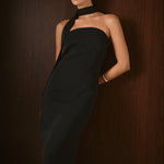 Make a statement in the Choker Midi Dress, a sleek, strapless silhouette that flows effortlessly to a dramatic slit at the back. The attached choker adds an unexpected, edgy detail, elevating the look with a touch of bold femininity. Designed with a hidden zipper for a clean finish, this dress is as practical as it is striking. Perfect for formal occasions.