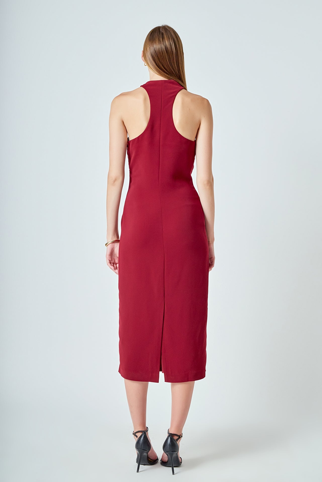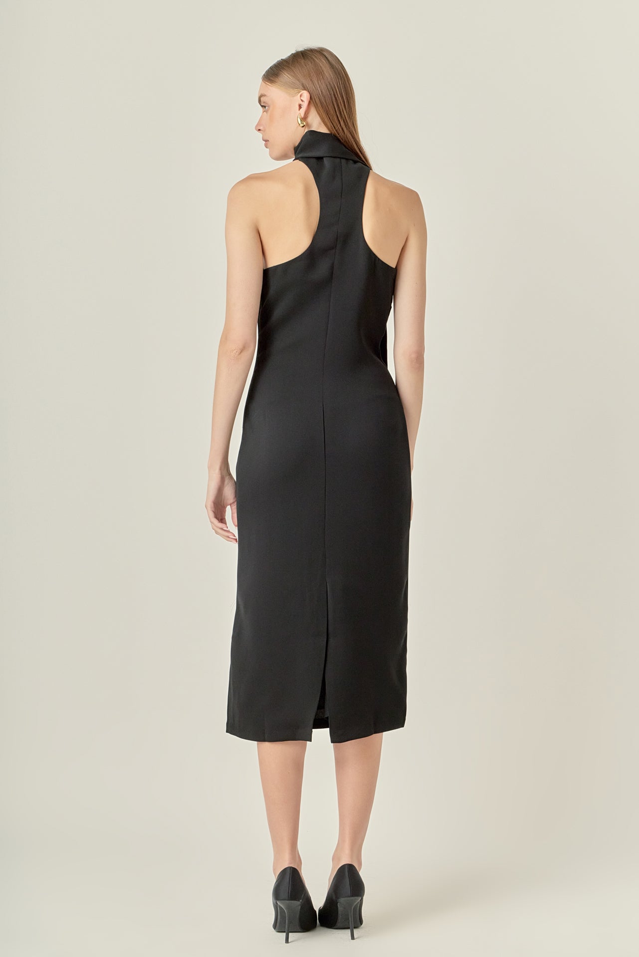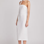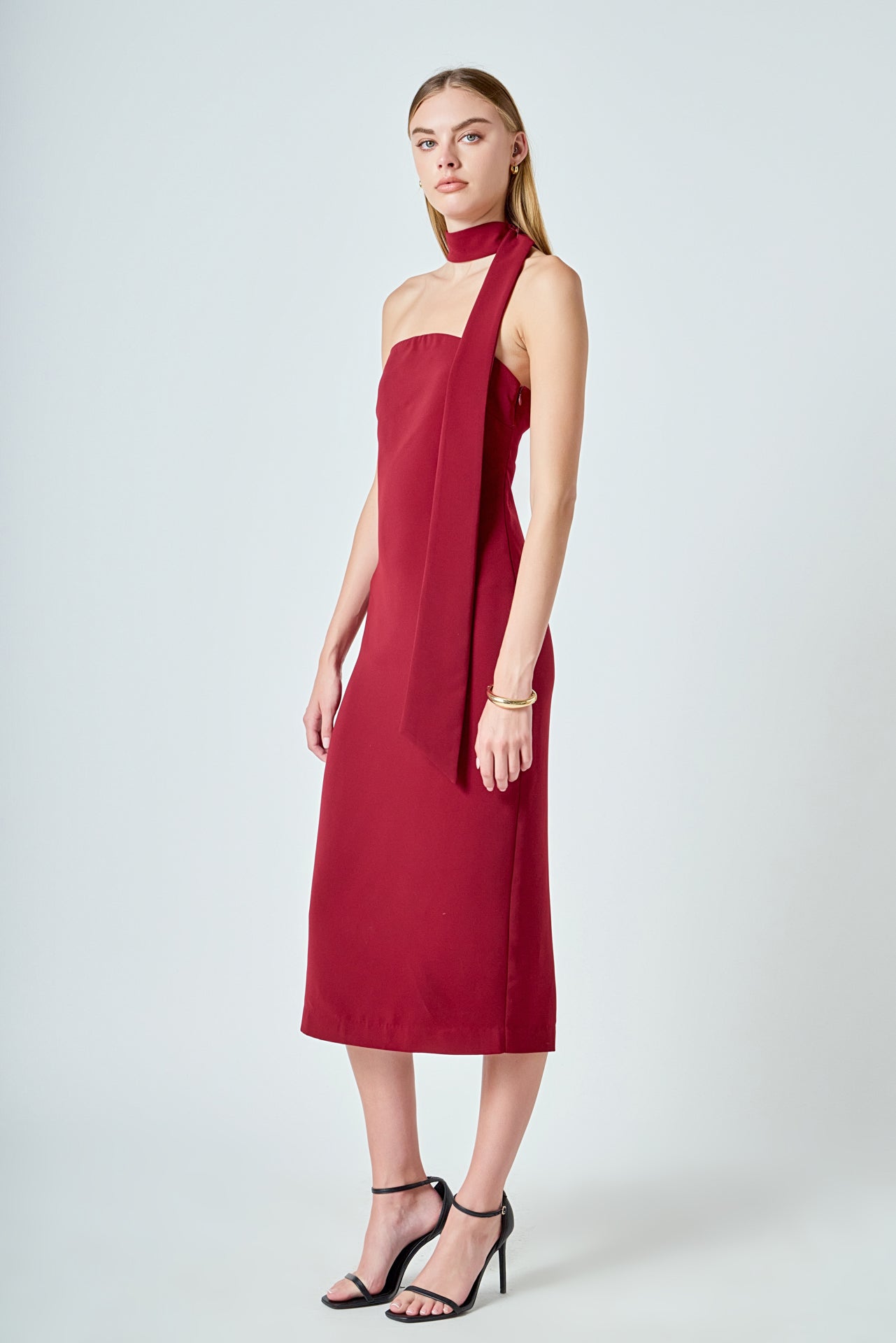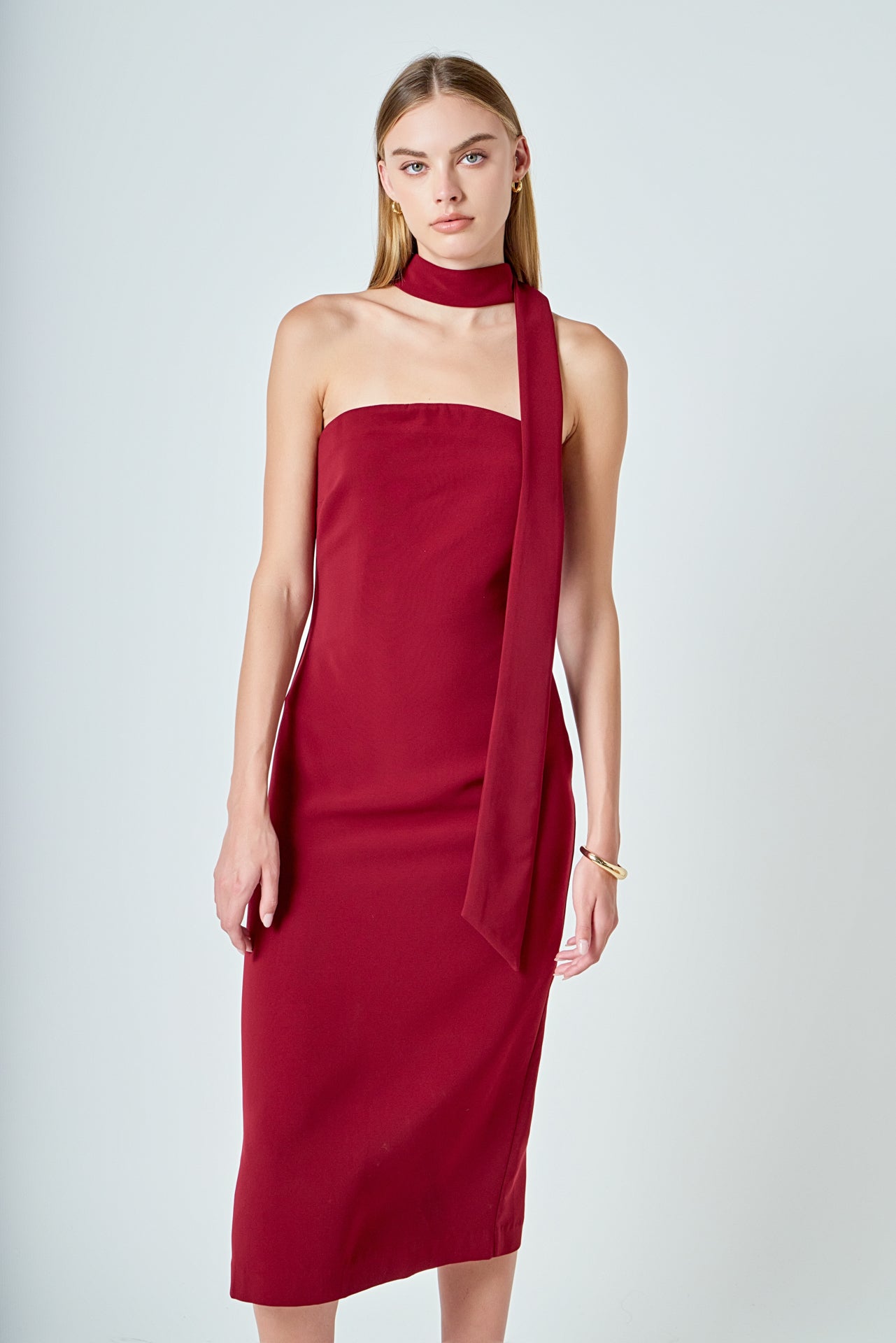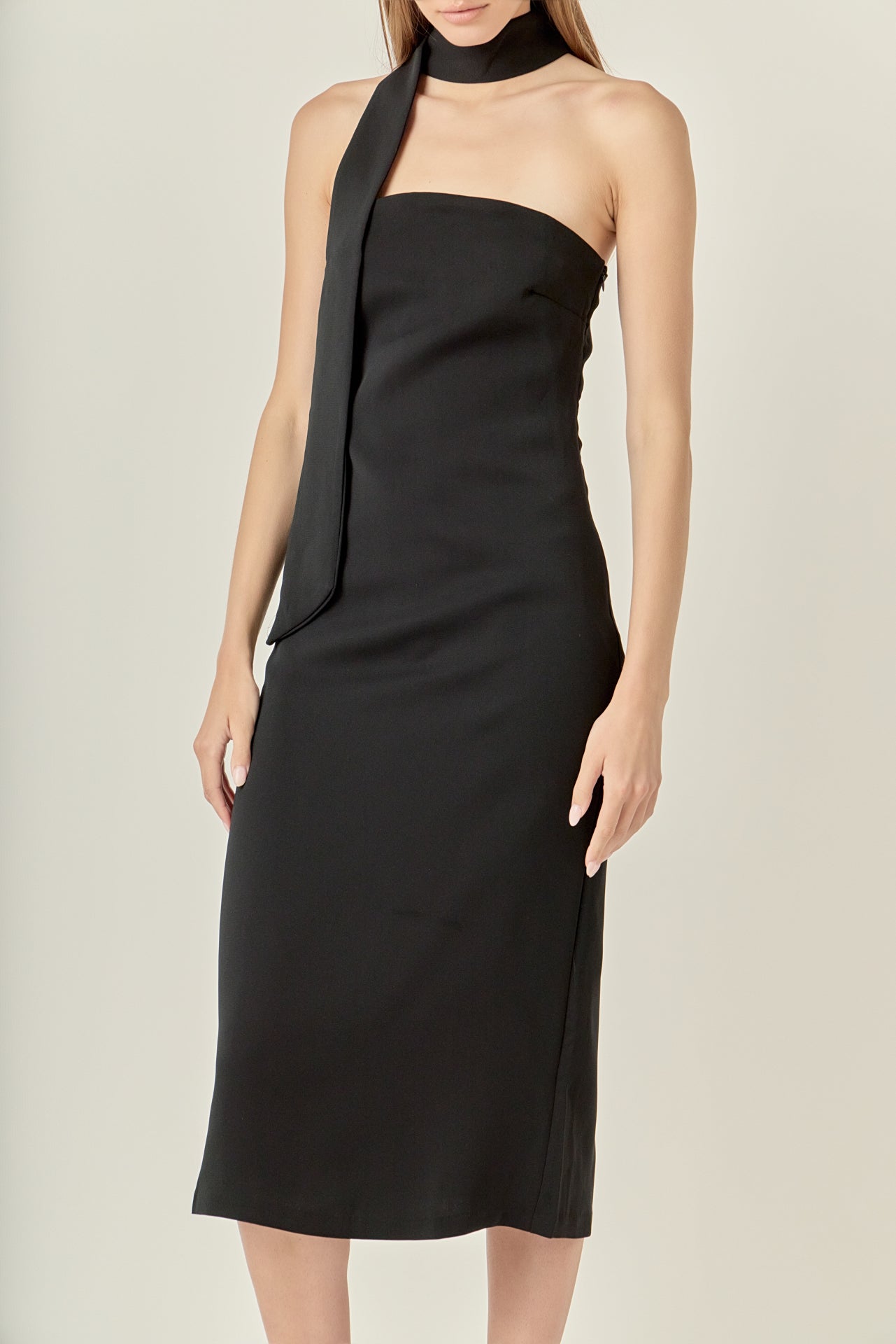 Make a statement in the Choker Midi Dress, a sleek, strapless silhouette that flows effortlessly to a dramatic slit at the back. The attached choker adds an unexpected, edgy detail, elevating the look with a touch of bold femininity. Designed with a hidden zipper for a clean finish, this dress is as practical as it is striking. Perfect for formal occasions.