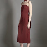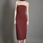 Make a statement in the Choker Midi Dress, a sleek, strapless silhouette that flows effortlessly to a dramatic slit at the back. The attached choker adds an unexpected, edgy detail, elevating the look with a touch of bold femininity. Designed with a hidden zipper for a clean finish, this dress is as practical as it is striking. Perfect for formal occasions.