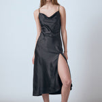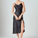 Made of silky satin, this slip dress is perfect for all of your special occasions. You'll feel sleek and sexy, but also comfortable. The beautiful cowl neck is perfect for highlighting necklaces and the thigh-high slit lets you show off some leg. Plus, the chain straps add a subtle touch of glamour.