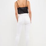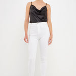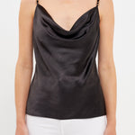 This simple but beautiful satin camisole features gold chain straps that effortlessly create a luxe look. The cowl neck is perfect for showing off your collarbones and accentuates necklaces beautifully.