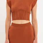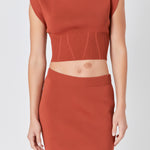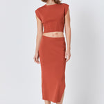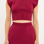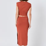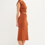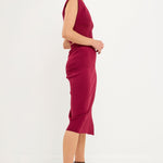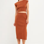 This sleeveless knit top is perfect for the office or a day out with friends. The trending color and fitted style make it stand out from the crowd, while the matching midi skirt makes it a great outfit choice for any occasion.