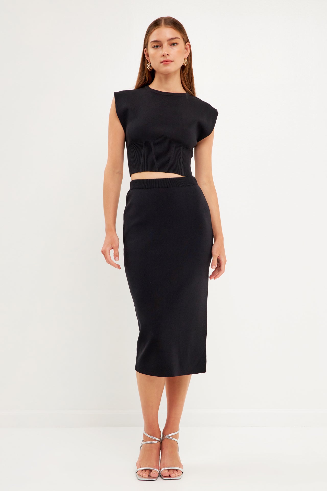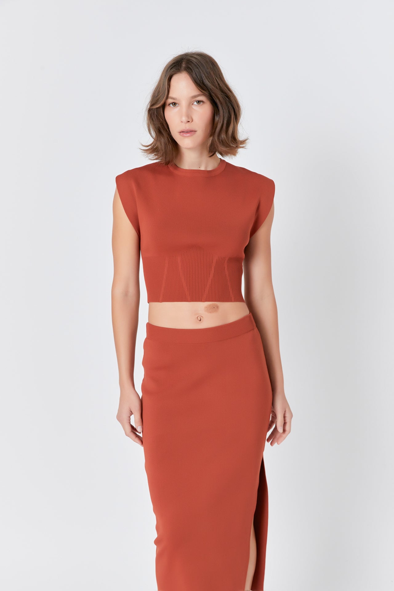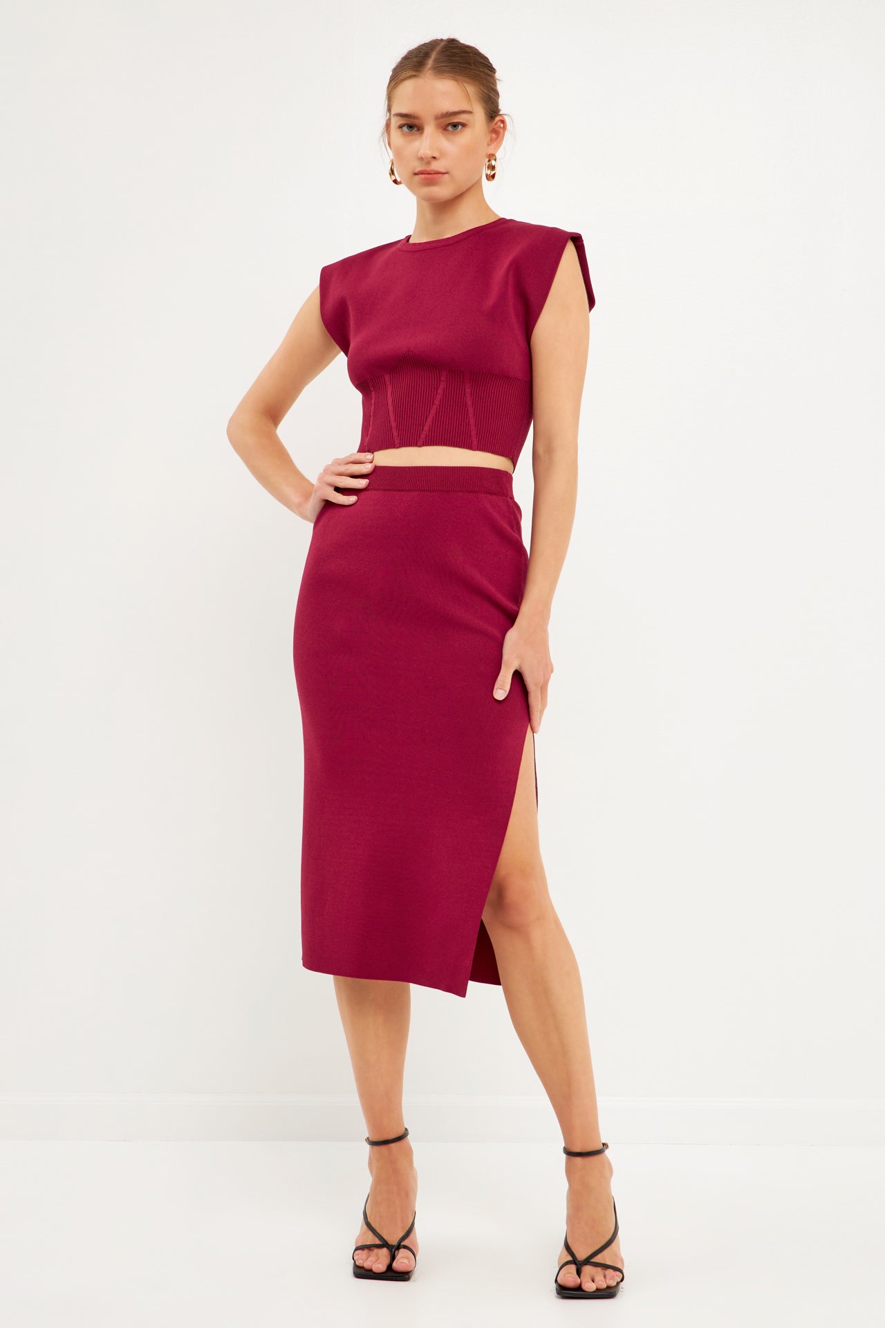 This sleeveless knit top is perfect for the office or a day out with friends. The trending color and fitted style make it stand out from the crowd, while the matching midi skirt makes it a great outfit choice for any occasion.