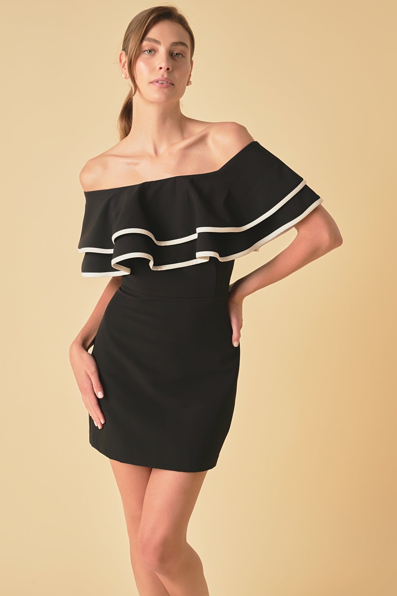 The perfect flamboyant little black dress to wear on your nights out. The striking layered ruffles are highlighted by contrast binding. And you don't have to worry about your dress falling because we've added gel grippers along the top. So you can dance the night away without a care in the world!