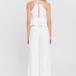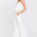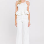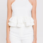 Introducing our Crepe Crop Top, the perfect addition to your summer wardrobe! This cami top features a button closure at the center back for a secure fit and a flattering cut out design at the center back. The 2 tiered ruffles at the hem add a flirty touch to this must-have piece. With a lined bodice for added comfort, this top is perfect for any occasion. The lightweight and breezy crepe fabric will keep you cool and stylish all day long. Don't miss out on this trendy piece, perfect for pairing with your favorite high waisted bottoms. Shop now and elevate your summer style!