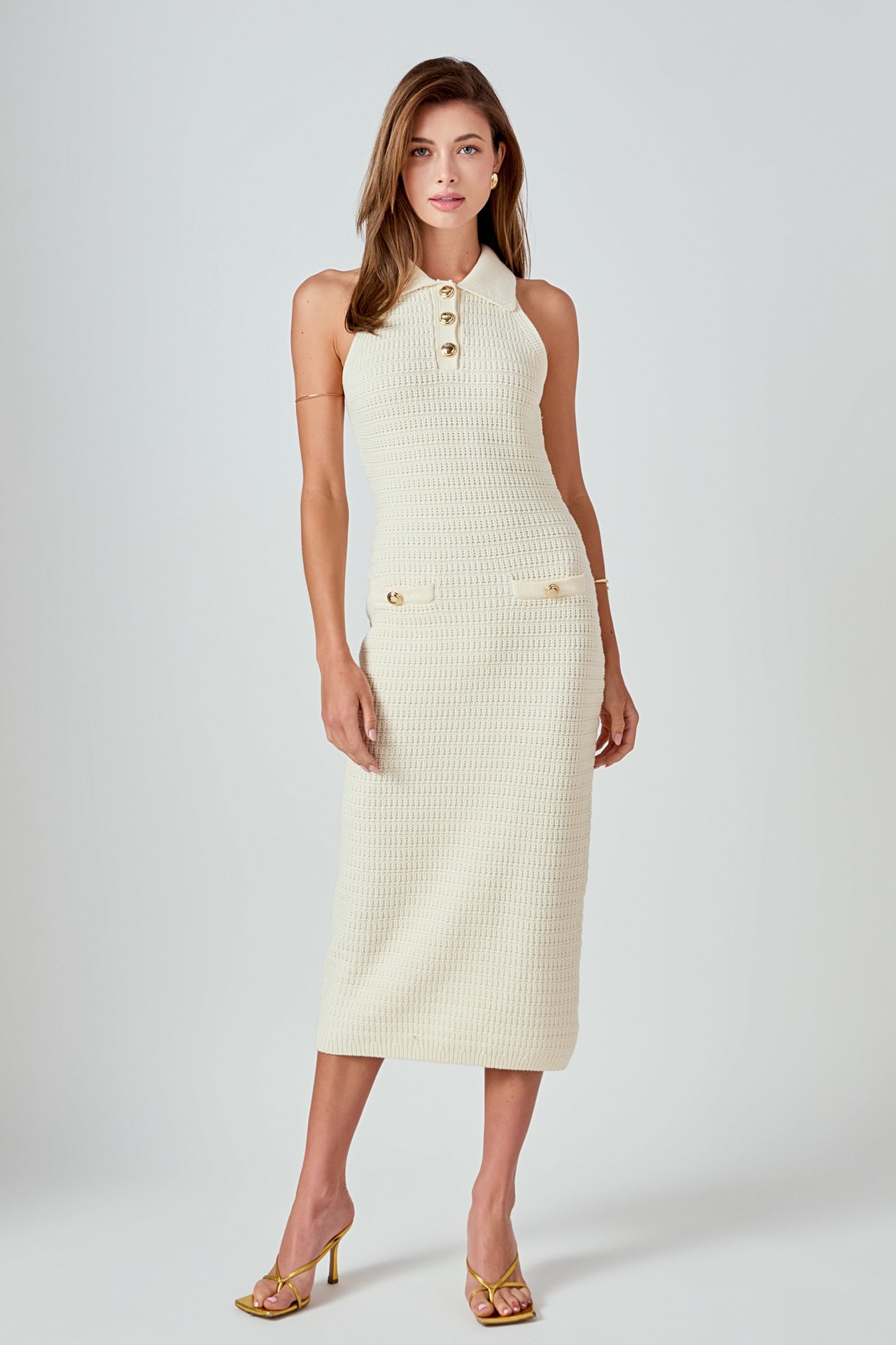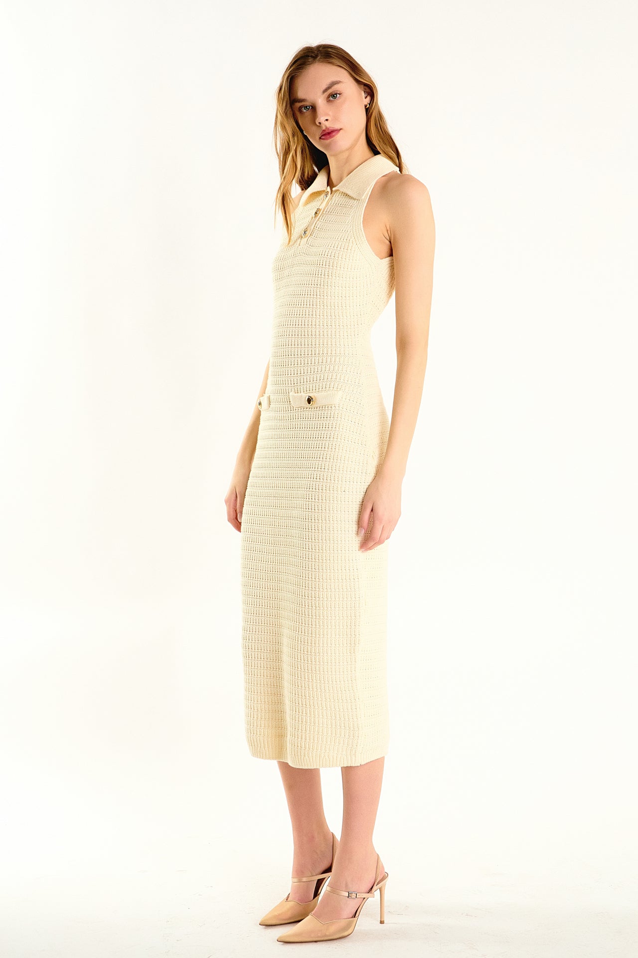 Introducing our chic and stylish Crochet Knit Midi Dress! This dress is every fashionista's dream with its stunning crochet knit design and elegant collar with placket detail. The racerback adds a modern touch, while the faux welt pockets provide a functional yet fashionable element. Perfect for a day out with friends or a special event, this dress is versatile and on-trend. Shop now and make a statement wherever you go!