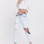 Introducing our must-have Cropped Long Sleeve Shirt, perfect for the fashion-forward woman. With a trendy crop length and long sleeves, this shirt is both stylish and versatile. The fabric covered buttons add a touch of elegance, while the slits at the cuffs give it an edgy look. Made with high quality materials, this shirt is sure to become a wardrobe staple. From casual to dressy, this top can be styled in endless ways. Stand out from the crowd with our must-have Cropped Long Sleeve Shirt. Shop now and elevate your wardrobe!