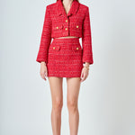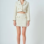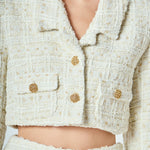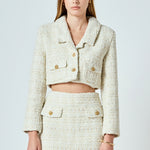 This cropped jacket is constructed with high-quality tweed and detailed gold buttons. Also, the shoulder pads add a structured element to the piece, so it lays on you beautifully.