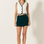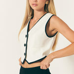 Introducing our must-have Cropped Vest With Binding Detail perfect for any stylish wardrobe. This versatile top features a unique cropped design and front round buttons for easy closure. The black binding adds a touch of sophistication while the lining ensures maximum comfort. Made for the modern fashionista this top is sure to elevate any outfit. Suitable for any occasion from casual to dressy it's a must-have for any fashion-forward individual. Complete your look with this trendy vest and make a statement wherever you go. Get yours now and be the envy of everyone. Shop the Cropped Vest With Binding Detail today!