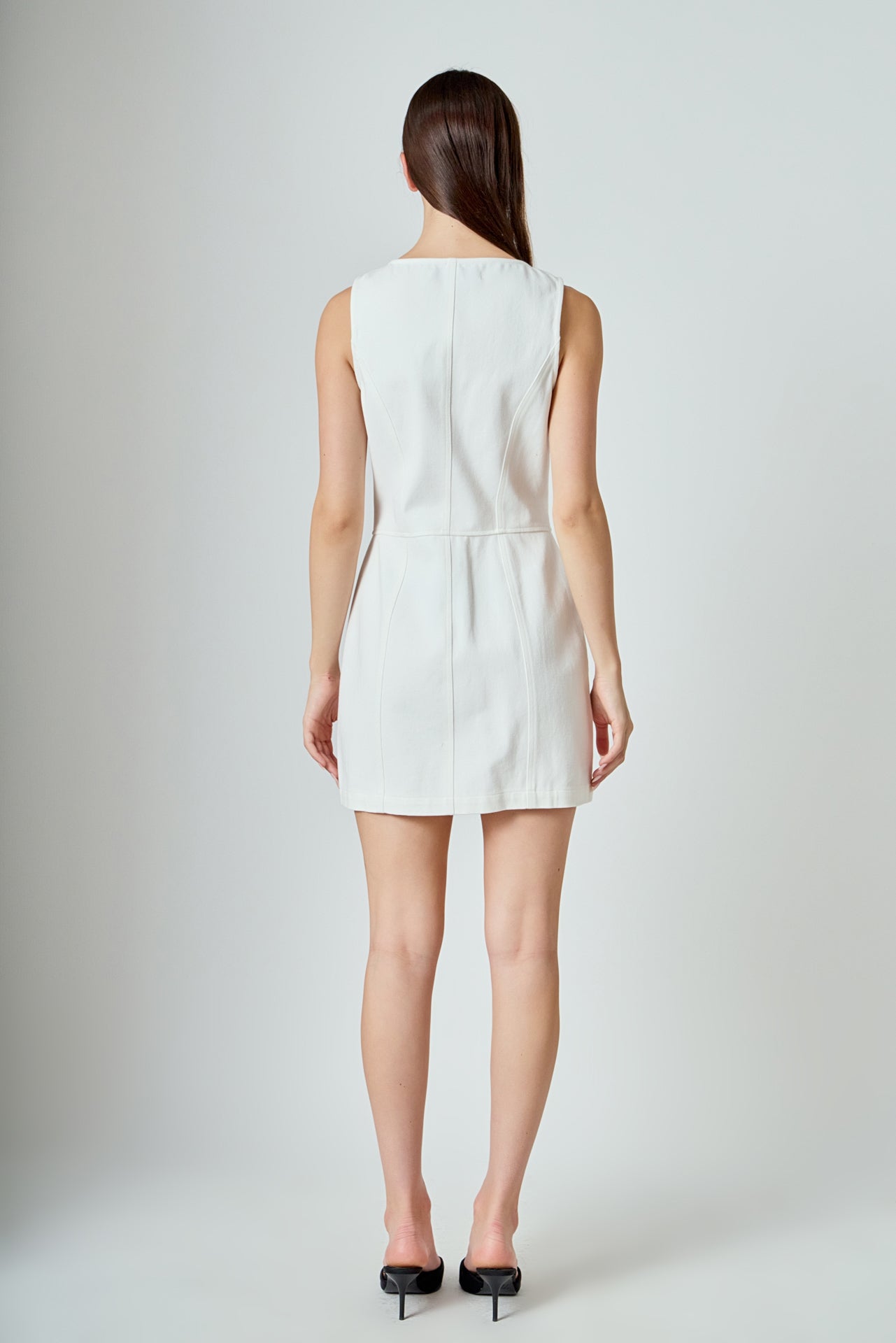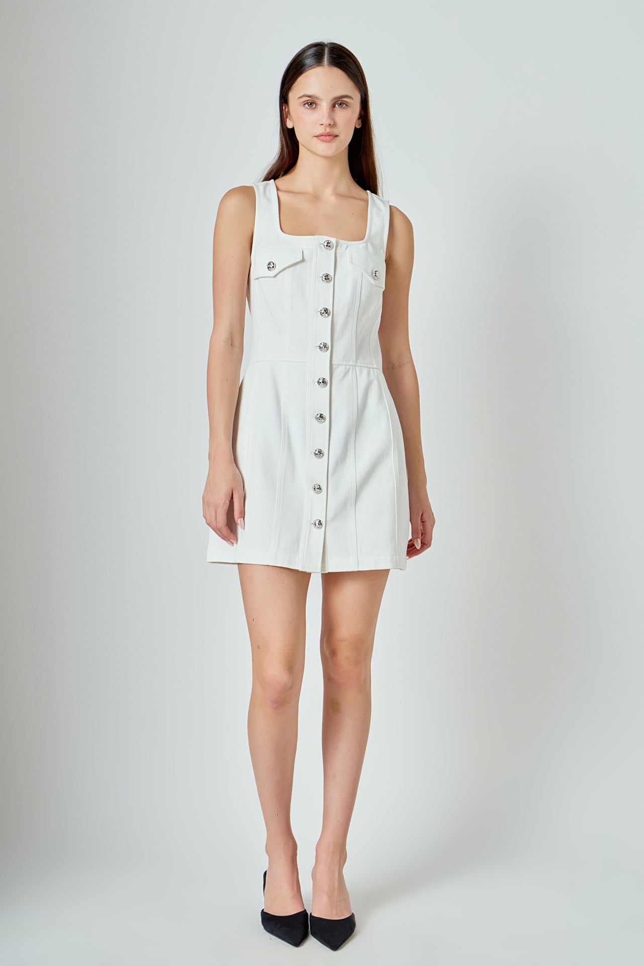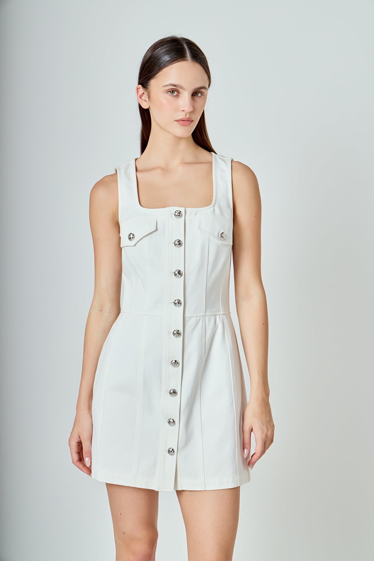 Upgrade your wardrobe with our must-have Denim Button Up Mini Dress. Featuring a mini length, front buttons for a touch of vintage charm, and of-the-moment sleeveless design, this dress is perfect for showcasing your curves. The princess seams create a flattering silhouette, while the denim fabric offers both style and comfort. Ideal for any occasion, from day to night. Shop now to add this versatile and statement-making piece to your collection.