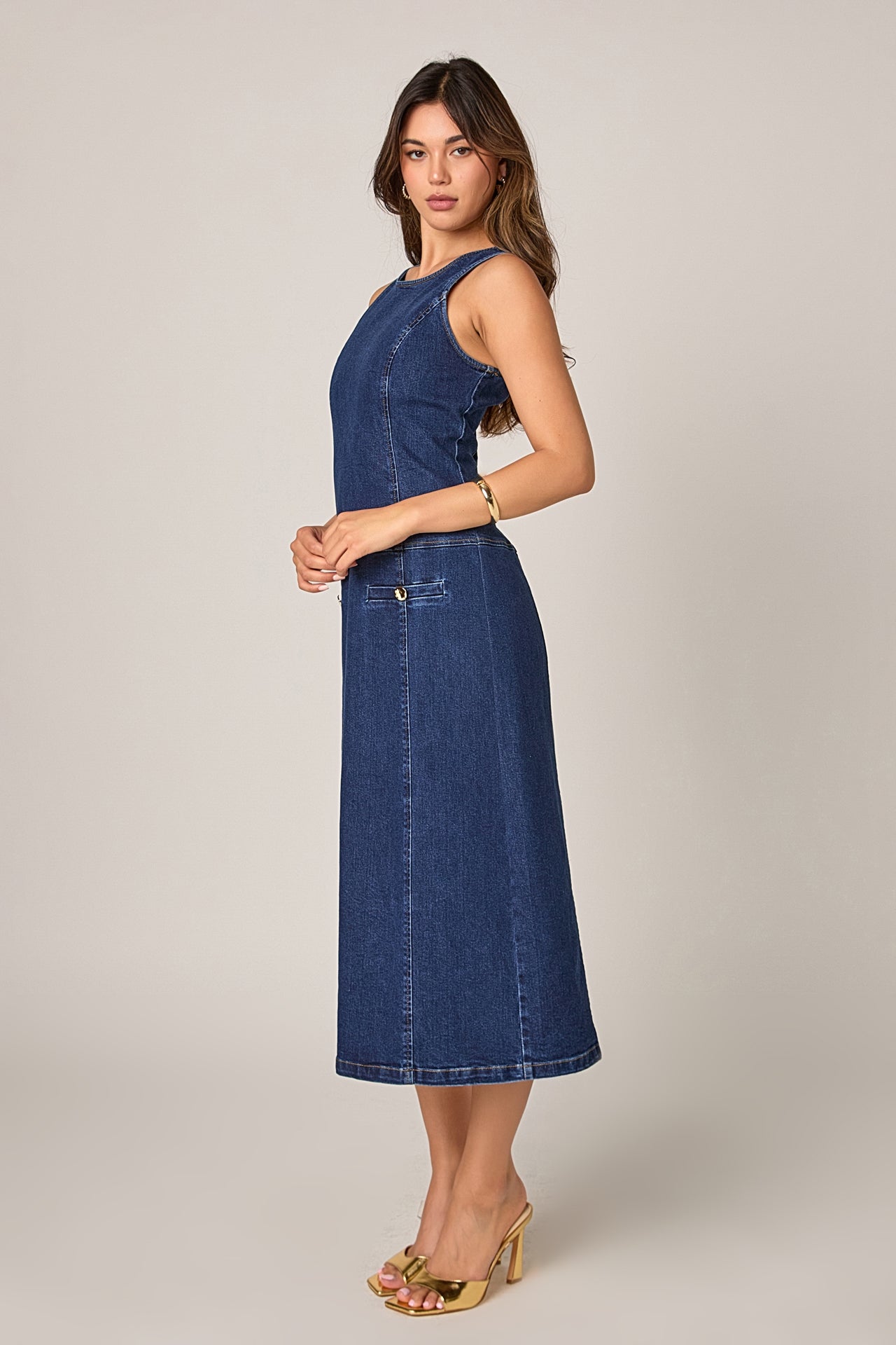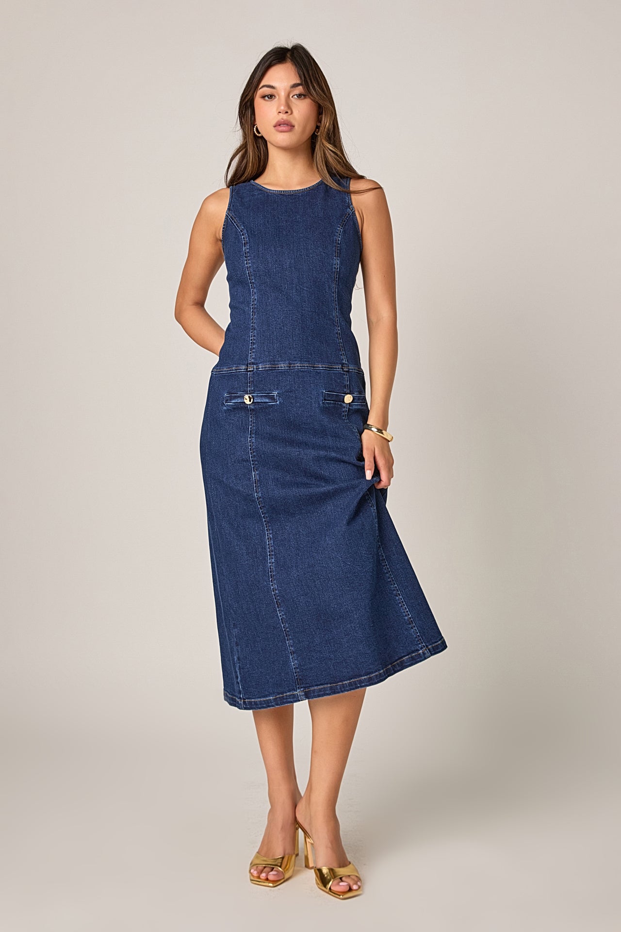Introducing our must-have Denim Drop Waist Midi Dress, a versatile addition to your wardrobe. Crafted from high-quality denim fabric, this dress offers both style and comfort. The drop waist design complements your figure while the midi length adds a touch of elegance. With a sleeveless cut, this dress is perfect for warmer days or easily transitioned into colder seasons with layers. Dress it up with heels or pair with sneakers for a casual chic look. Embrace the relaxed yet chic vibe of this denim dress, perfect for any occasion. Shop now and elevate your denim game!