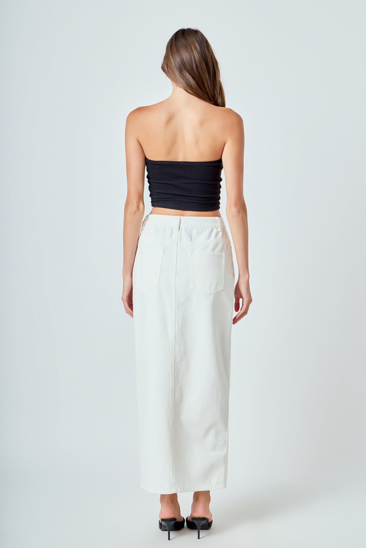 Experience maximum comfort in our Denim Maxi Skirt. Our mid-length pocket-filled denim skirt will keep you looking stylish no matter the occasion. The slit at the center front adds the perfect touch to the piece making it an attractive choice for all. Perfect for any season our maxi skirt will have you standing out from the crowd. Shop sleek denim skirts today and experience the maximum comfort our maxi length delivers.