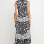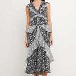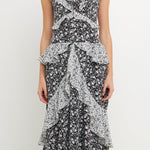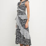 This Dot Floral Contrast Midi Ruffle Dress is perfect for a day or night out. The mixed black floral print is stunning and the sleeveless design keeps you cool on those hot summer days. The midi length gives this dress a touch of elegance, making it perfect for any special occasion.