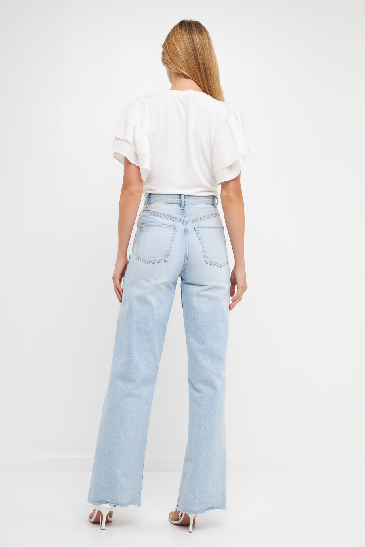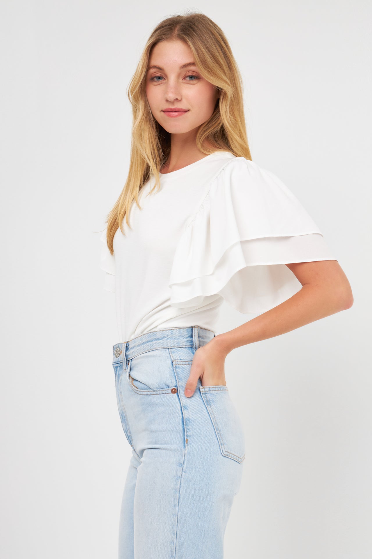 This Double Layers Ruffle Sleeve Crew Neck Top is the perfect statement top for any professional woman. The white top features beautiful ruffled sleeves that will add a touch of fun to any outfit. Whether you're dressing up for work or a special event, this top is sure to impress.