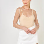 This beautiful top is made from a crystal-embellished mesh fabric. It comes with an ultra-soft and stretchy cami that has adjustable straps to make sure it fits you like a glove. This style is like getting two tops in one because you can wear the cami by itself with a comfortable lounge outfit. If you want, you can wear the mesh top over a lace bodysuit to give it a different look.