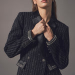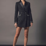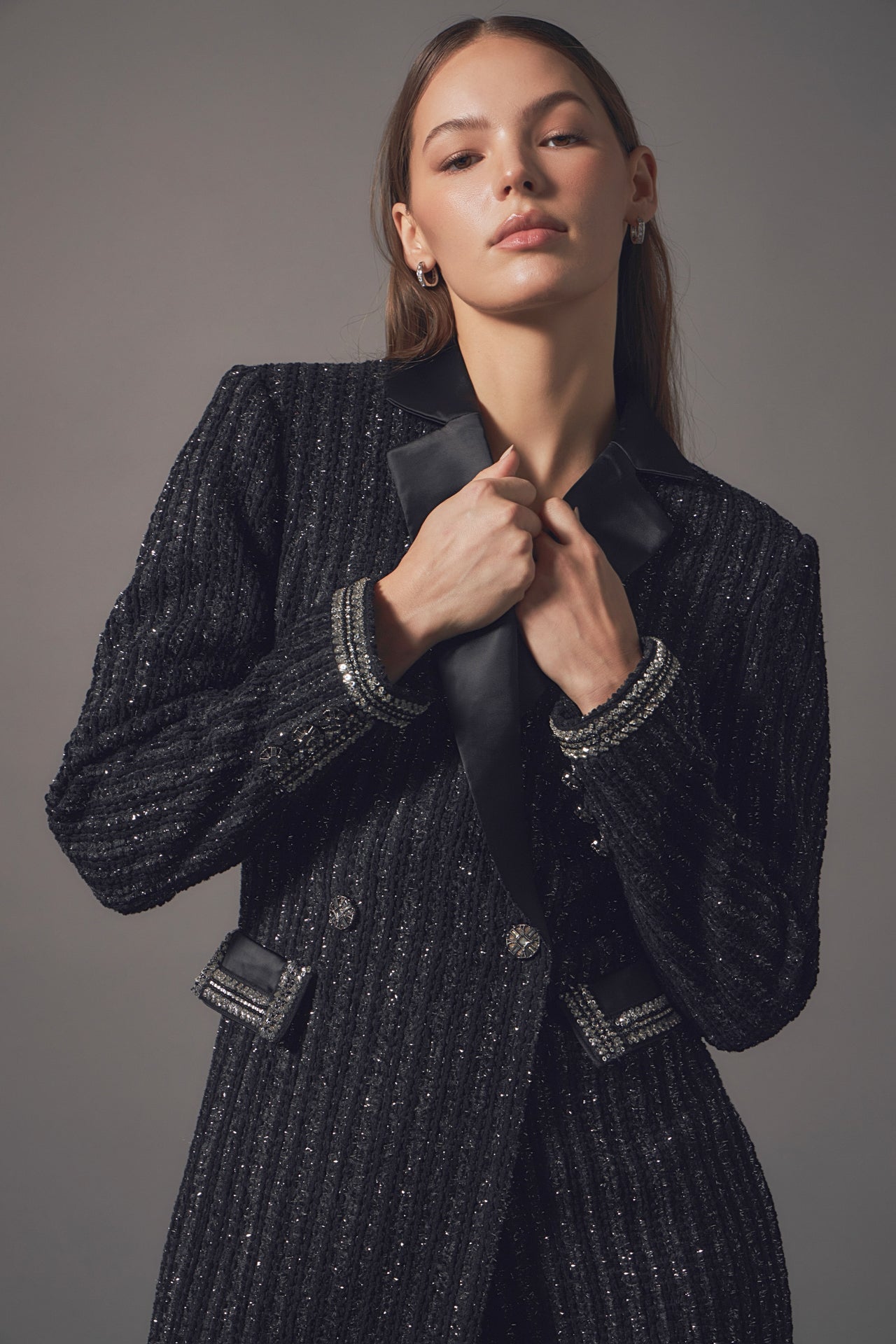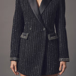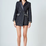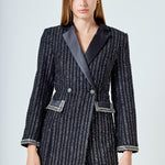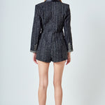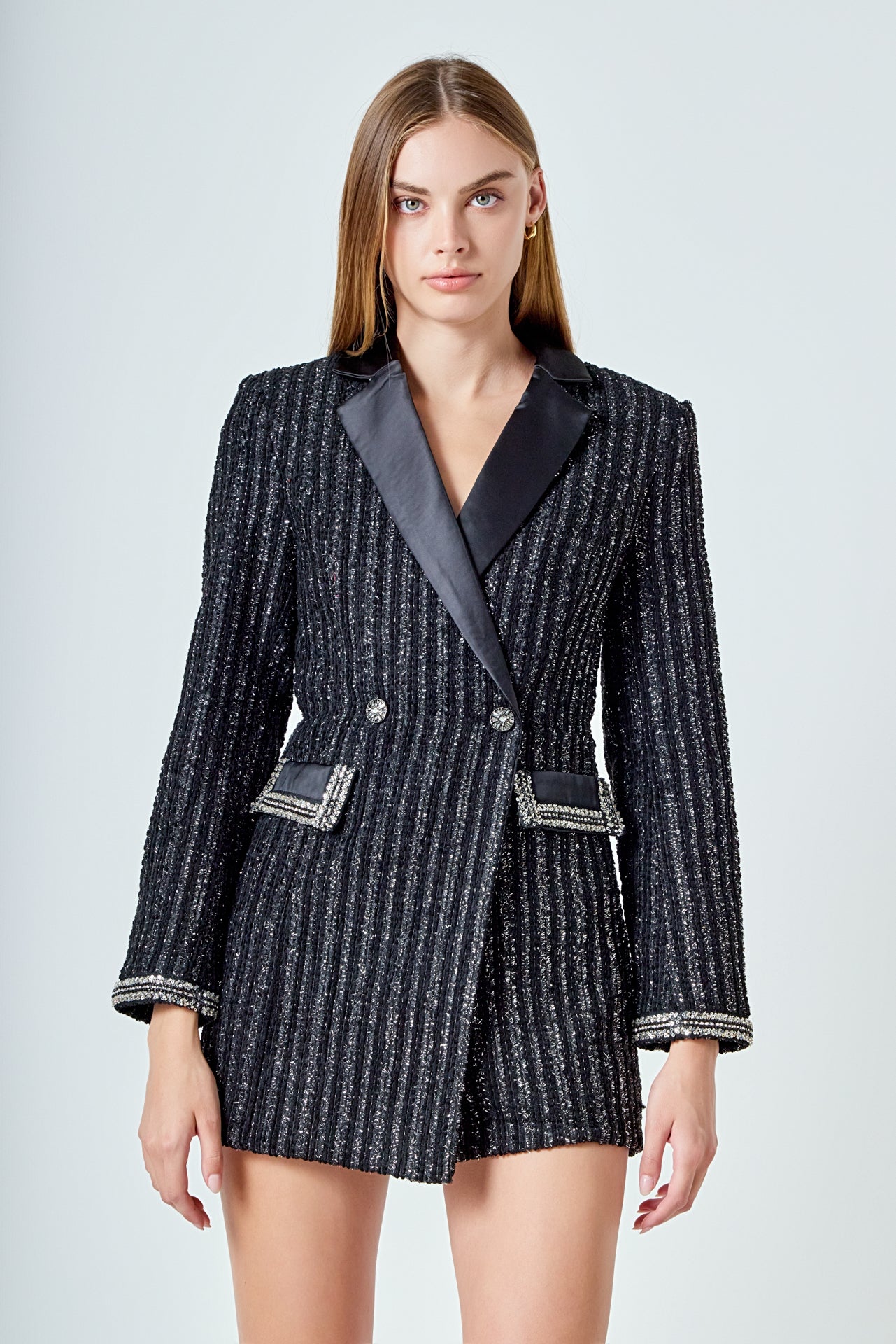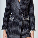 Introducing Embellishment Trim Edge Romper - ideal for making a bold fashion statement! Crafted from luxurious sequin tweed fabric this double-breasted romper features skinny lapels shoulder pads and eye-catching trim on the edges. Ideal for special events this romper is sure to make a lasting impression with its eye-catching design and superior quality. Get yours now and make a style statement like no other.