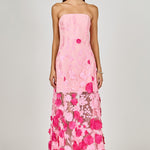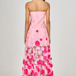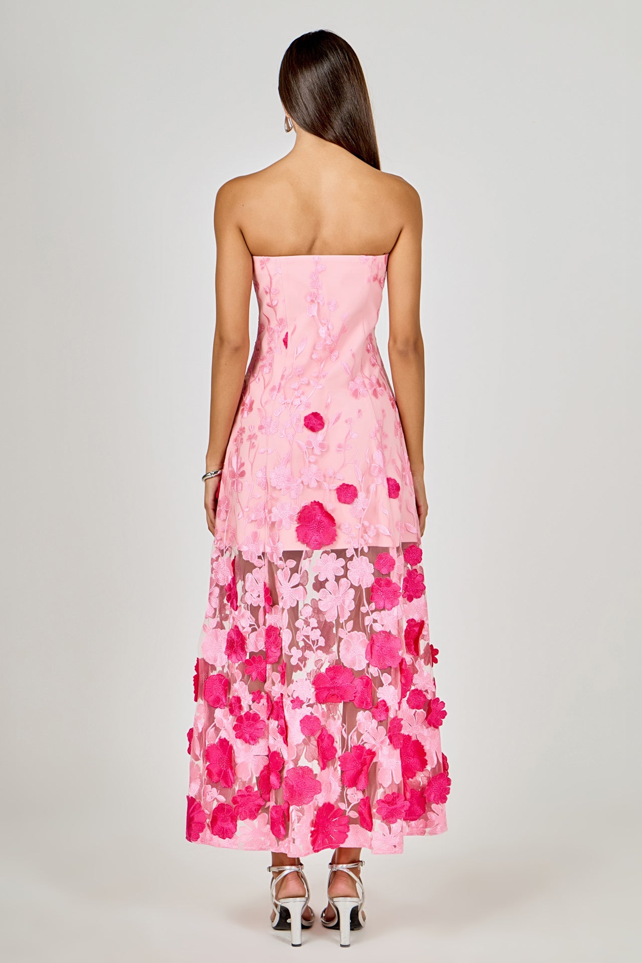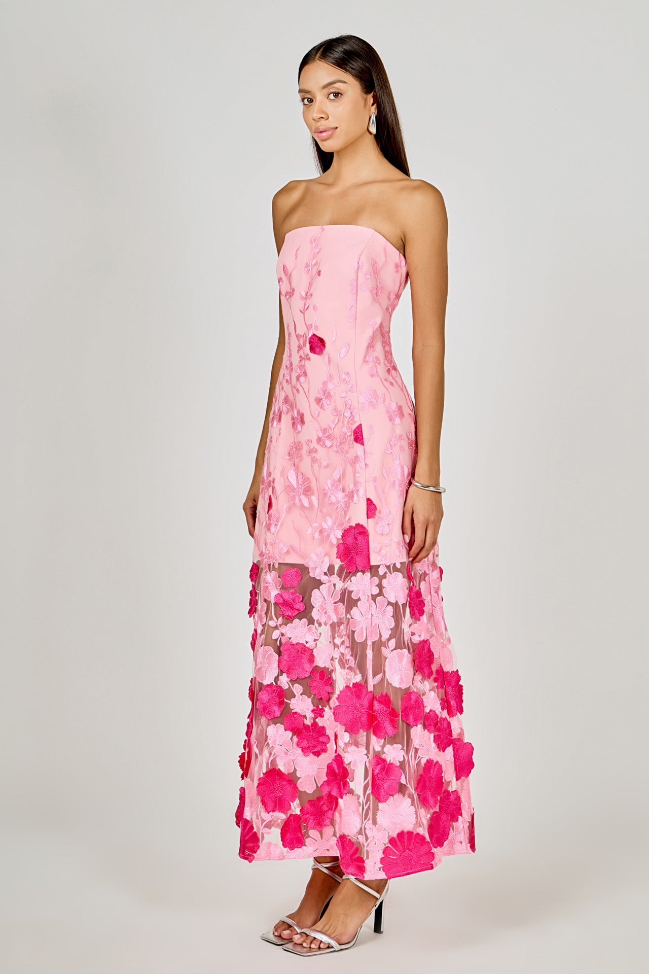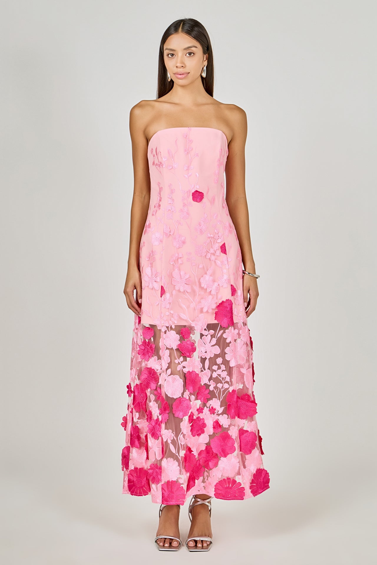 The Embroidered 3D Applique Strapless Maxi Dress is designed for moments that call for romance and sophistication. Lightweight mesh drapes effortlessly, while dimensional floral embroidery adds delicate texture. A straight, strapless neckline creates a timeless silhouette, perfect for weddings or evening events. Don't miss out on this must-have dress.