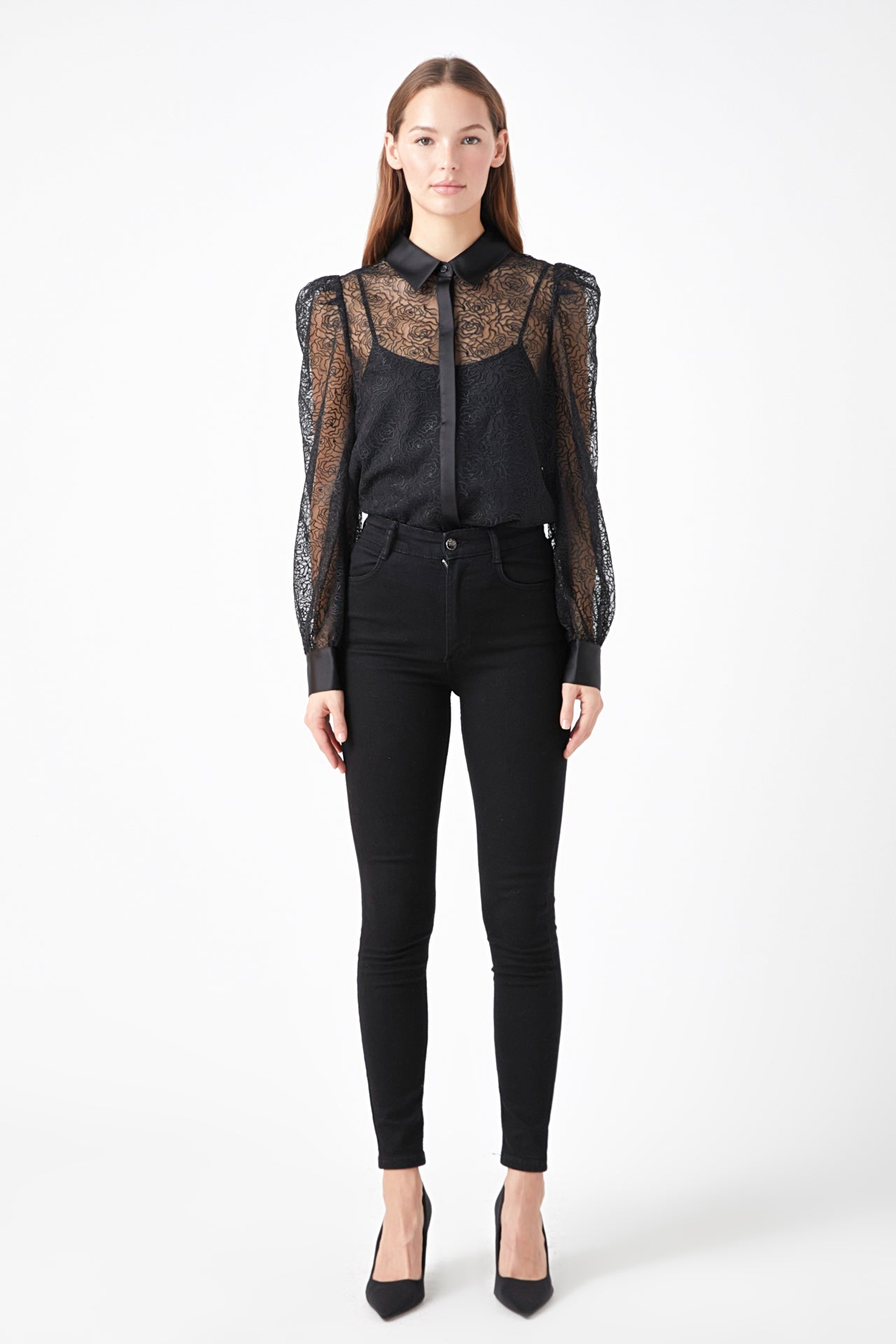 This blouse is sure to turn heads. The delicate embroidery work is beautiful, and the see-through mesh adds a sexy touch. The satin collar and sleeves give it a luxurious feel. The button-up style is classic, and the fit is flattering. The removable satin camisole provides extra coverage. You'll love how you feel in this blouse.