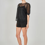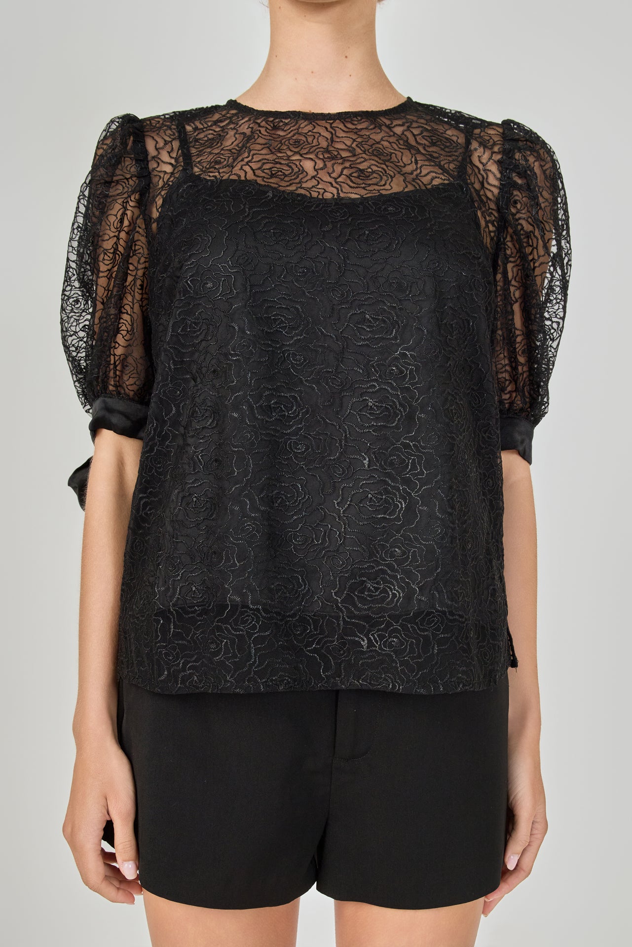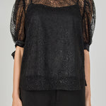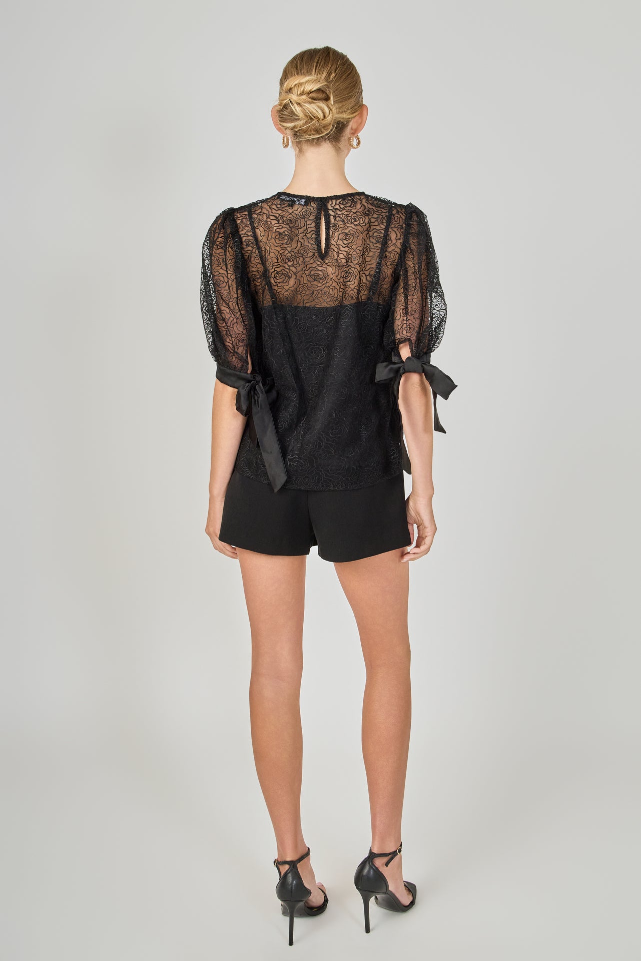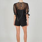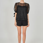 Embroidered Puff Sleeve Satin Bow Top