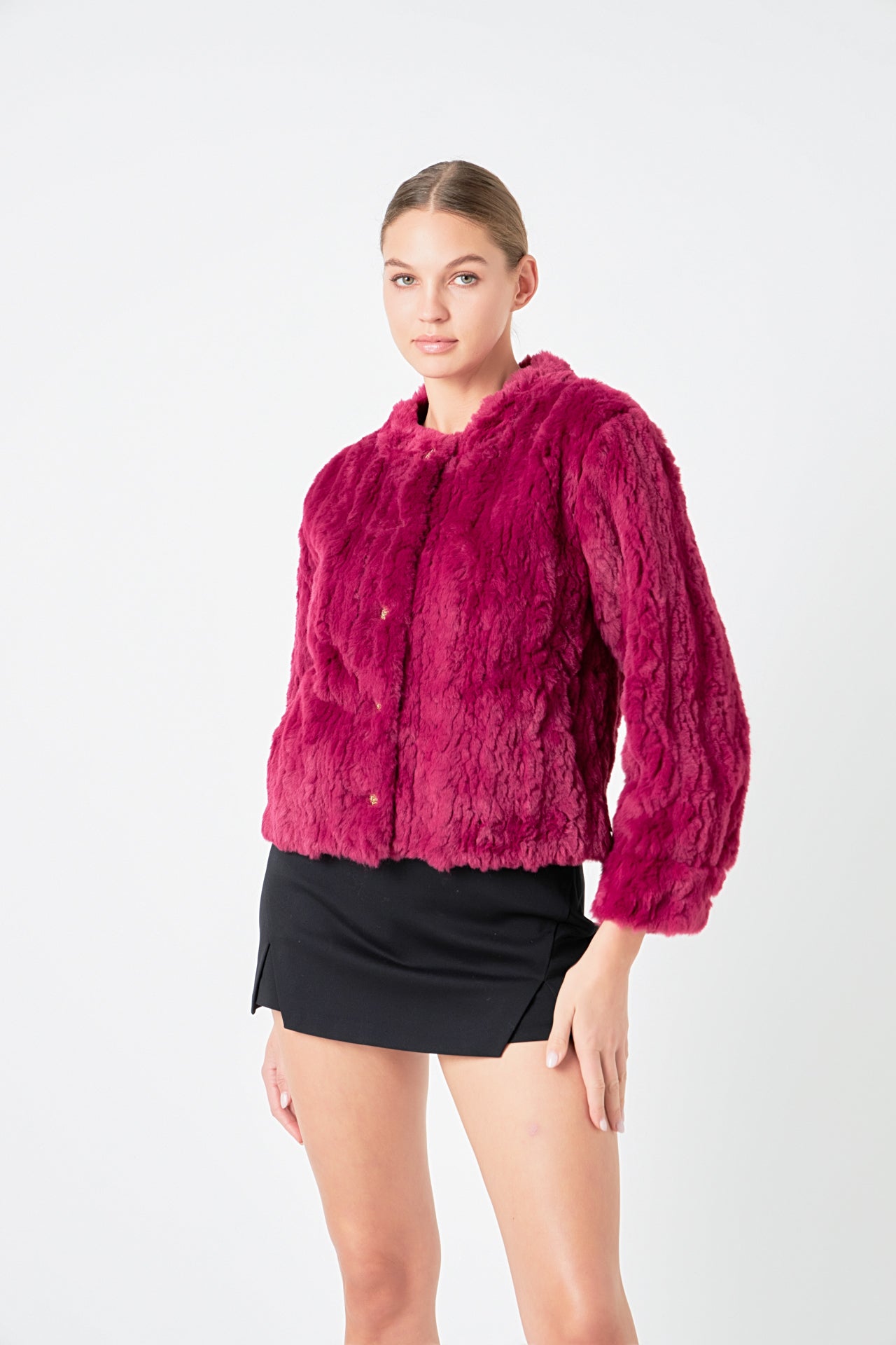 A faux fur jacket is the perfect way to elevate your look. This stylish Faux Fur Jacket is every bit luxurious as it is practical. The high-end faux fur fabric will keep you warm, even during chilly winter nights. Plus, the textured gold buttons add a bit of flair to this stylish ensemble.