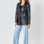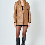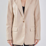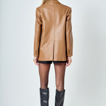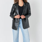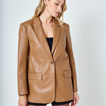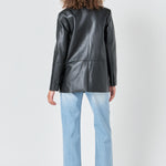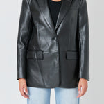 Up your style game with this Faux Leather Blazer and accomplish a chic, put-together look. Designed with shoulder pads, flap pockets, and notch lapels, this blazer will become your new go-to piece. Style it with a tweed dress, for work, or pair it with your favorite jeans, and a crop top, for drinks with friends.