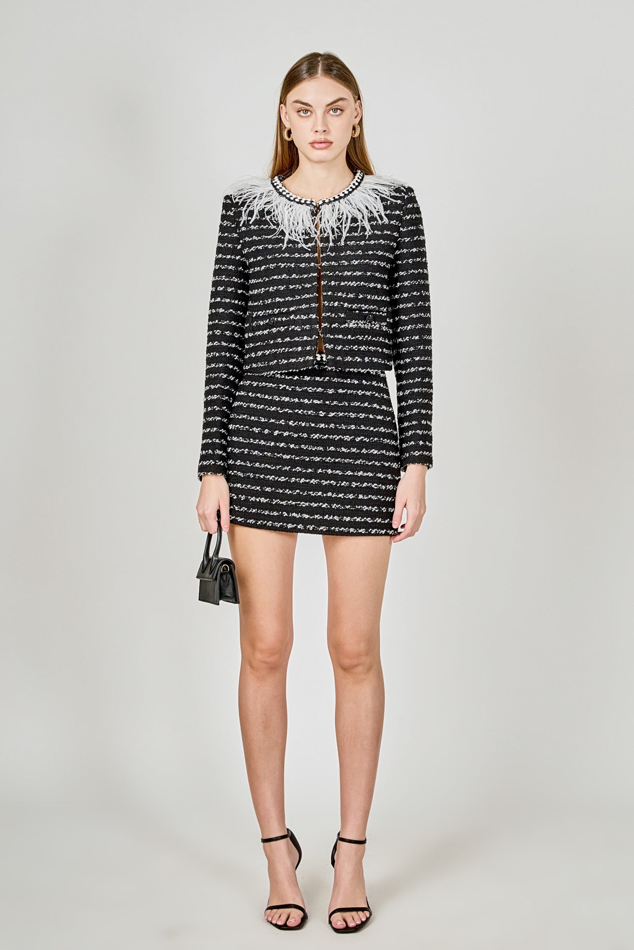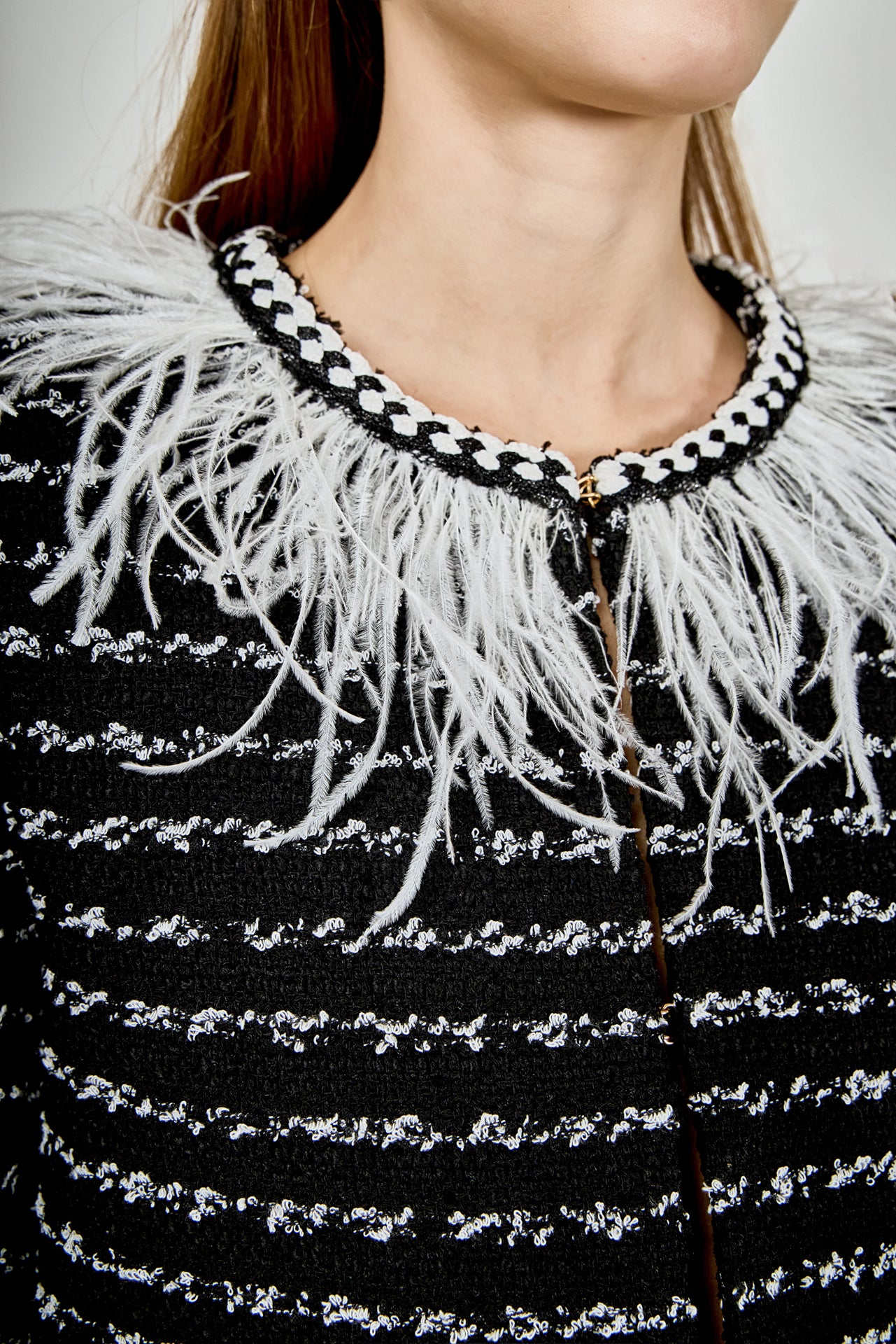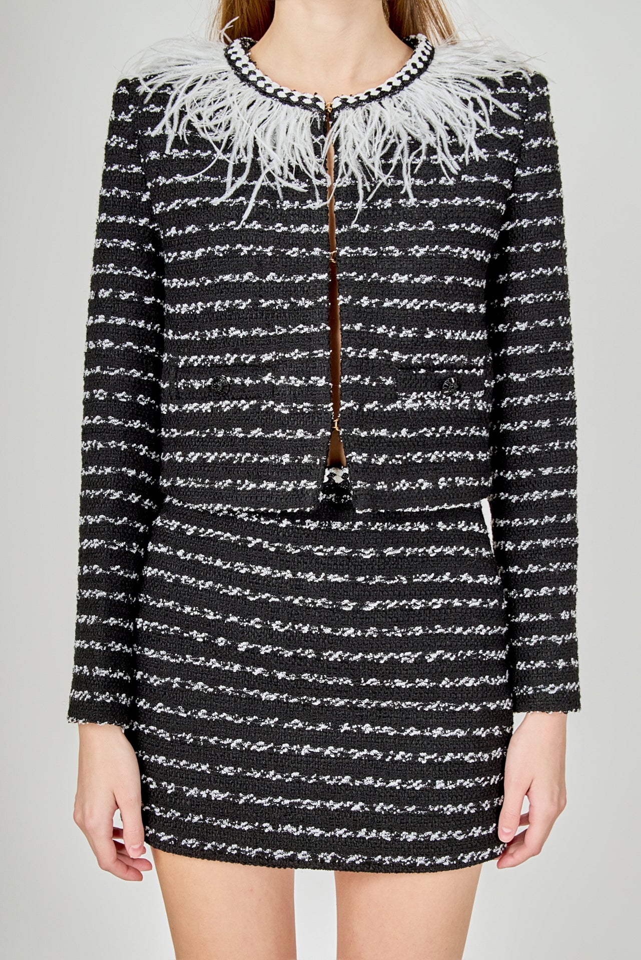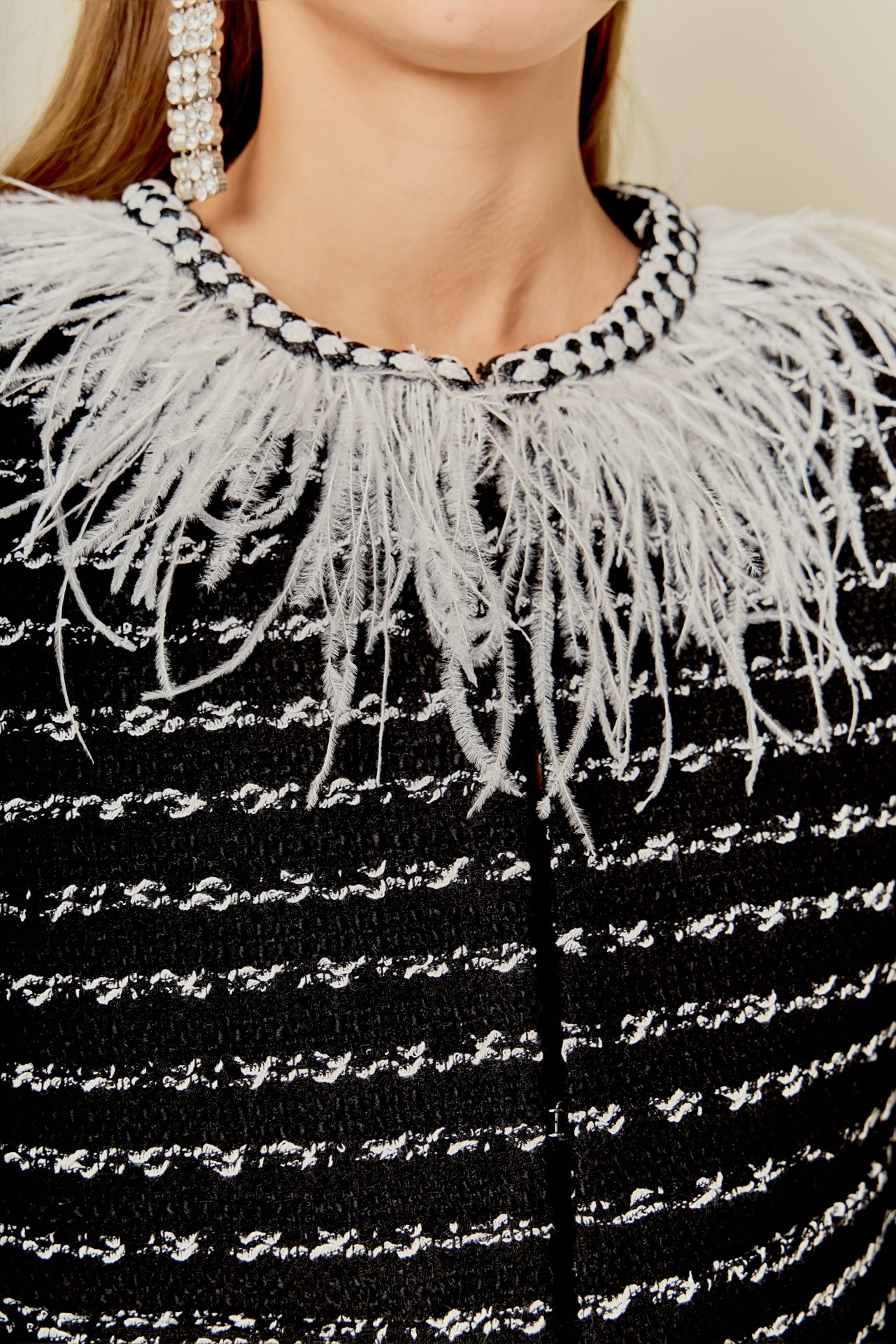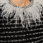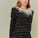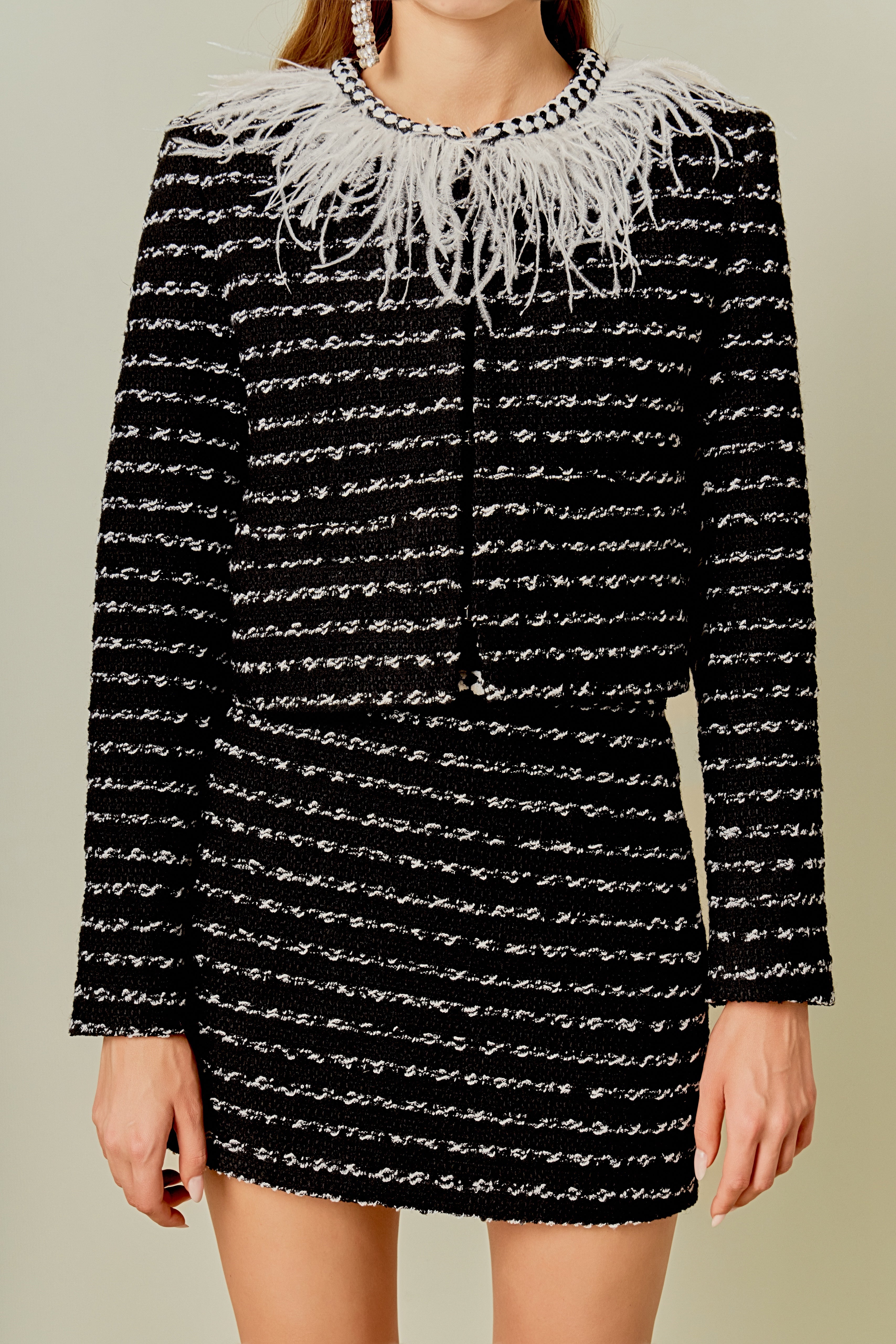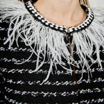 Introducing the ultimate statement piece for your wardrobe - our Feather Detailed Bow Tweed Jacket. This stunning jacket boasts a sleek round neckline and comfortable long sleeves, making it the epitome of both style and comfort. But what truly sets it apart is the exquisite feather detailing along the neckline, adding a touch of elegance and luxury. The front hook and bar closure provides a secure fit, making it perfect for any occasion. Whether worn for a special event or paired with your favorite everyday look, this jacket is sure to turn heads.