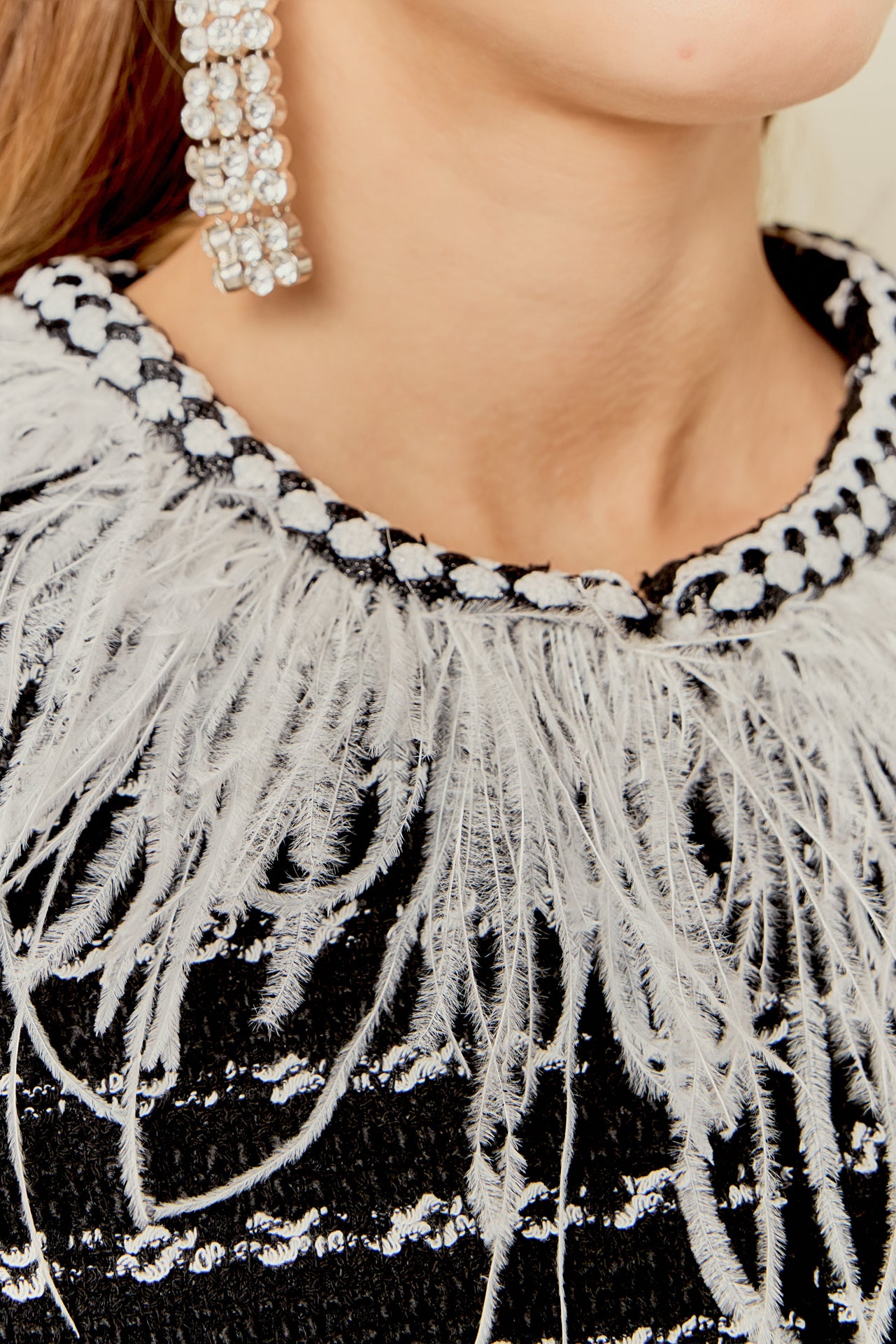 - Feather detail along the neckline